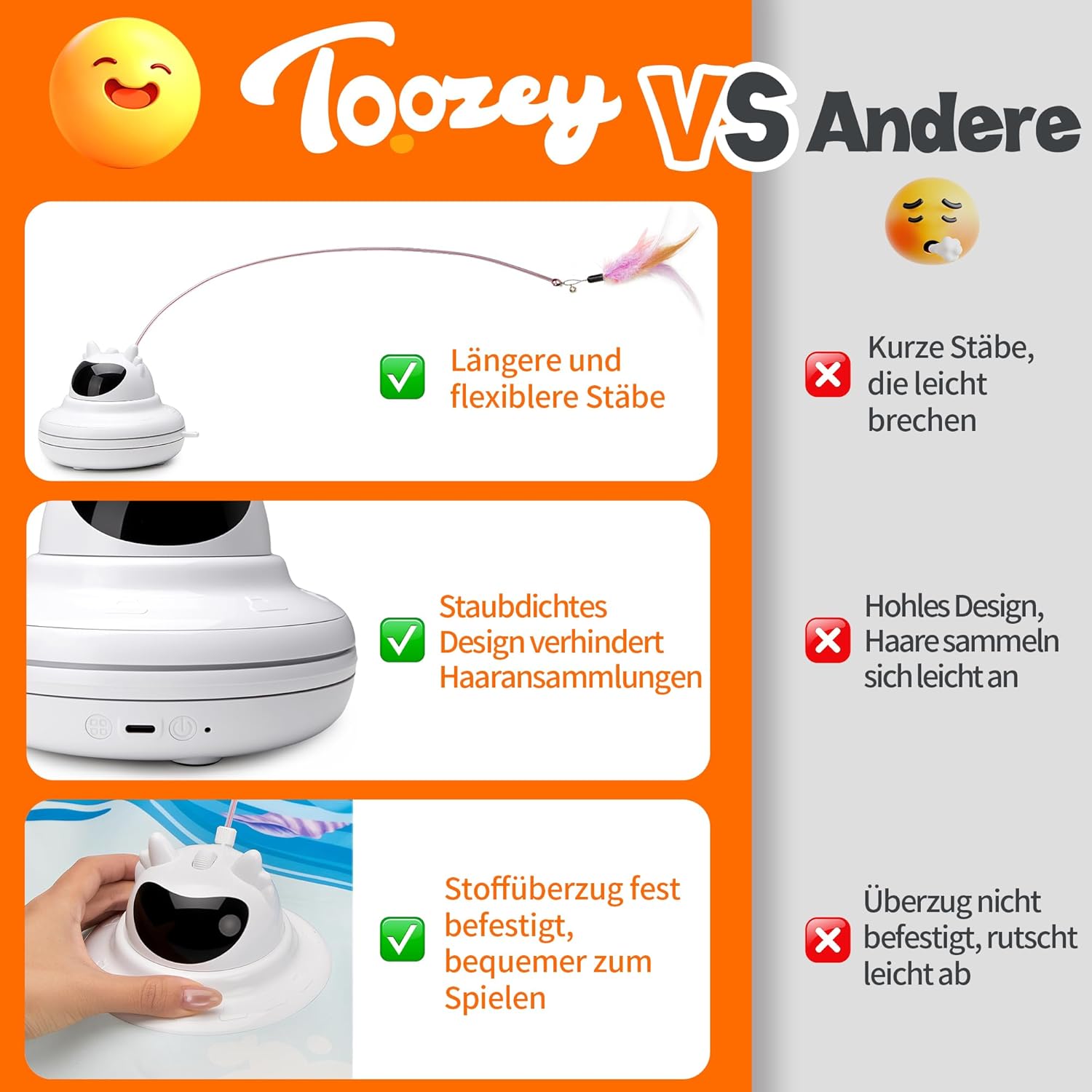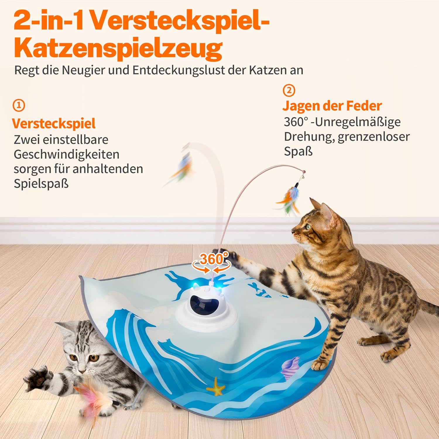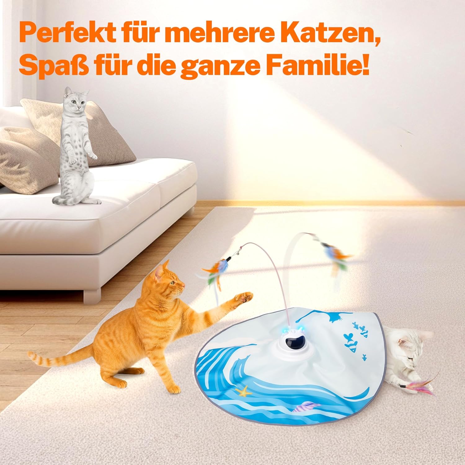 • Интерактивна играчка за котки 2 в 1: Тази интерактивна играчка за котки осигурява неограничено забавление, независимо дали котката ви умело гони отгоре, размахвайки пера, или любопитно се промъква за движещото се перо под плата. Перфектна е като самостоятелна играчка за домакинства с няколко котки: всяка котка ще намери свой собствен стил на игра, а играчките за котки никога няма да омръзнат.