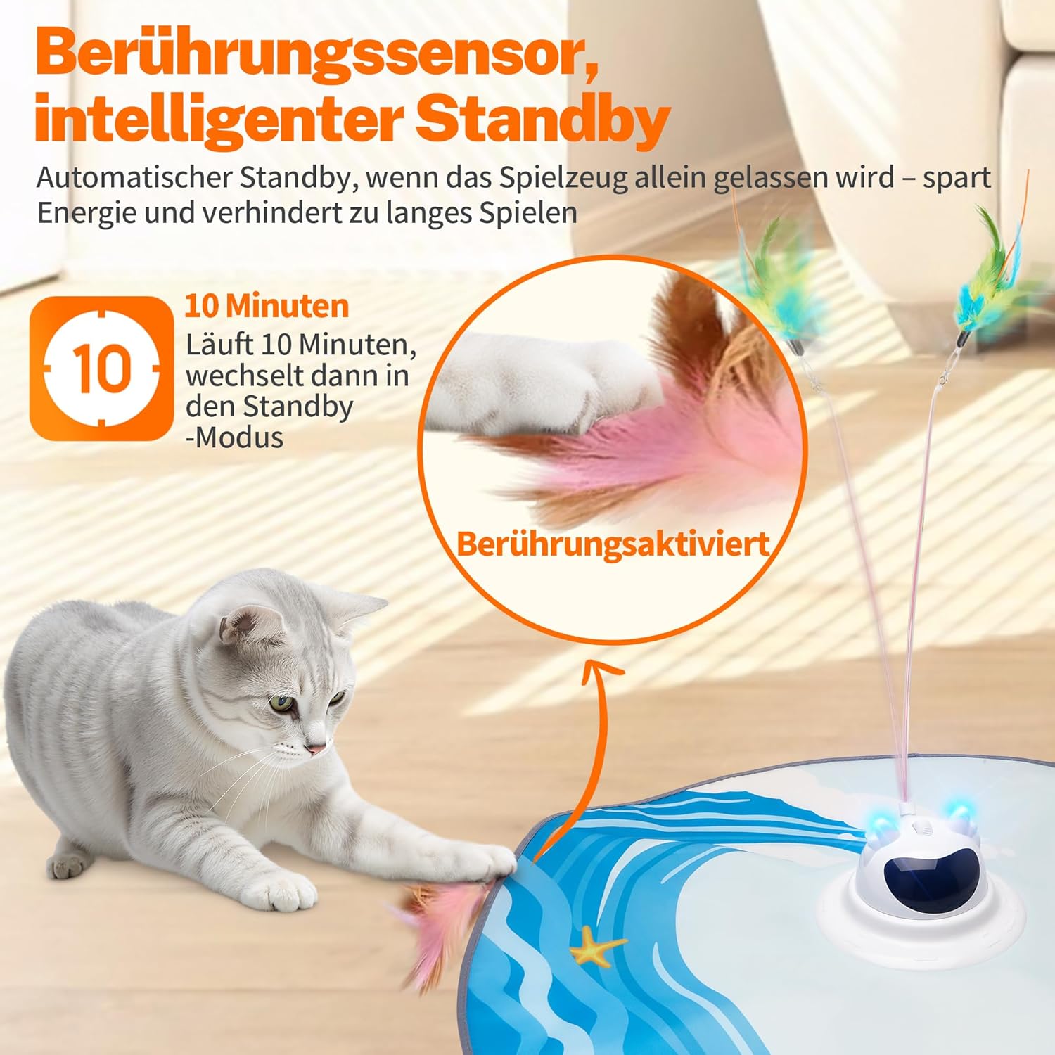• Интелигентна система за докосване и режим на готовност: нашите ентусиасти на електрически играчки за котки: след 10 минути тя автоматично спира. В режим на готовност тази играчка за котки остава енергийно ефективна и се активира отново при докосване. Ако няма взаимодействие в продължение на 5 часа, интерактивната играчка за котки се изключва безопасно - за максимална икономия на енергия и безопасност във вашия дом.