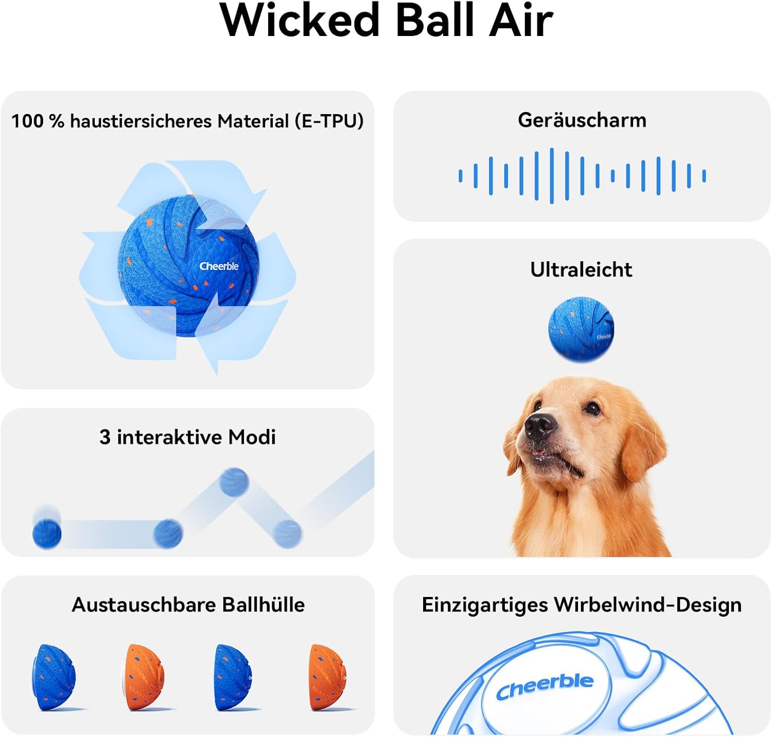 • БЕЗОПАСНО ЗА ДОМАШНИ ЛЮБИМЦИ ИЗДРЪЖЛИВО СМЕНЯЕМО Сменяемата външна обвивка на Wicked Ball Air е изработена от E-TPU, който е супер устойчив на дъвчене и екологичен. Между другото, сърцевините на "Wicked Rugby" (ASIN: B0FFFZ2JZ9) и "Wicked Ball AIR" са съвместими помежду си. Това означава, че е необходимо само да смените обвивката, когато купувате един от двата модела топки Cheerble, за да се насладите на забавните играчки за кучета и на двата модела.