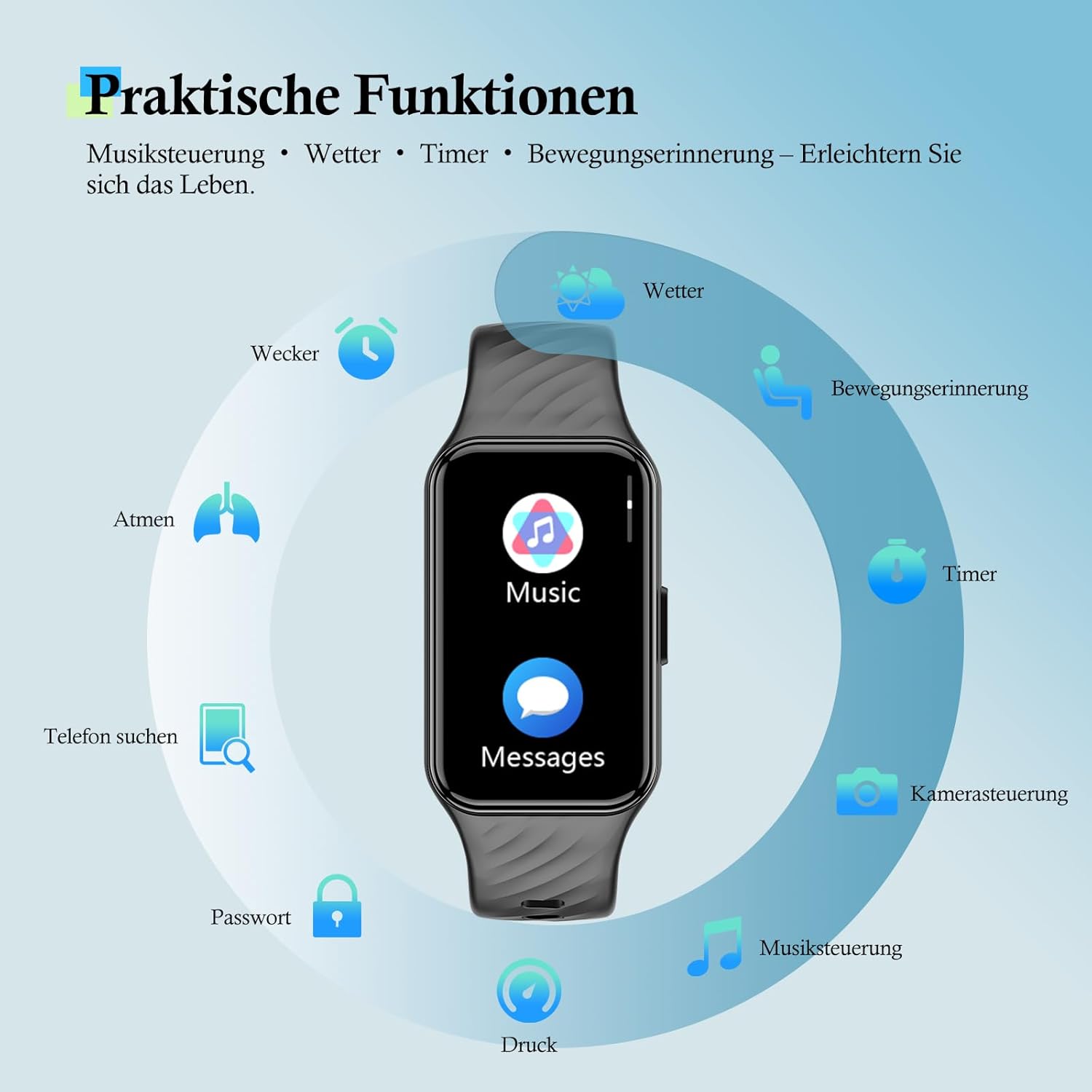 • Известия за съобщения и други функции: Когато смарт часовникът е свързан с телефон, той може да получава известия за обаждания, напомняния от календара, SMS известия и известия от Facebook, WhatsApp и други социални приложения. Той също така поддържа настройки за времето, аларми, хронометър, таймер за обратно броене и функции за намиране на телефон.