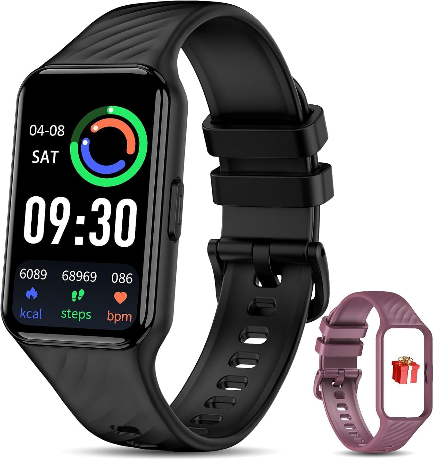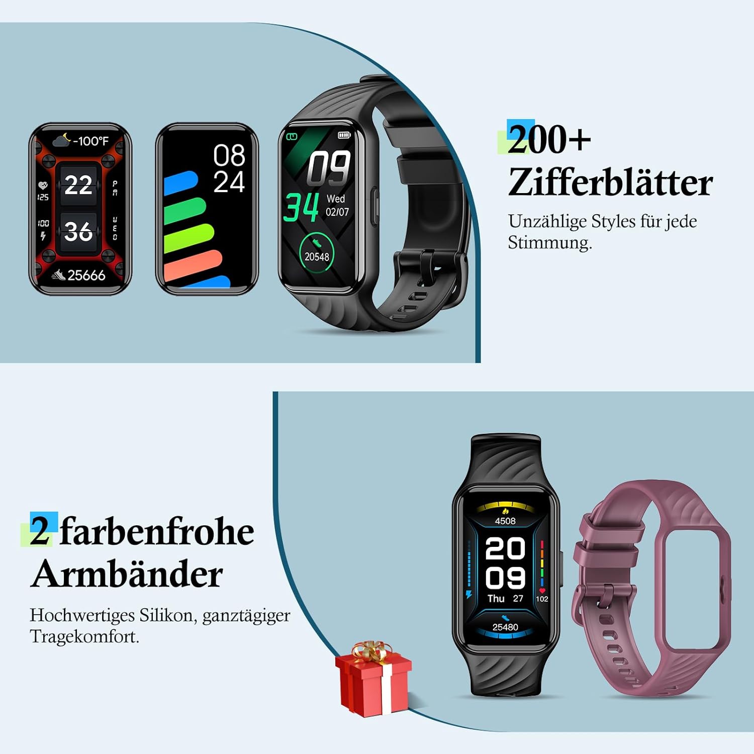 • HD дисплей и над 200 циферблата, както и две каишки: 1,47-инчовият циферблат пасва перфектно на китката ви. Гривната е изработена от висококачествен силикон, лека е и удобна и отговаря на изискванията на всеки, който цени комфортното прилягане. Смарт часовникът има над 200 онлайн циферблата с цветни шарки, от които да избирате. Можете също да качите снимка от телефона си като тапет. Каишките се предлагат в различни цветове, като всеки часовник се предлага с две сменяеми каишки в зависимост от вашите предпочитания.