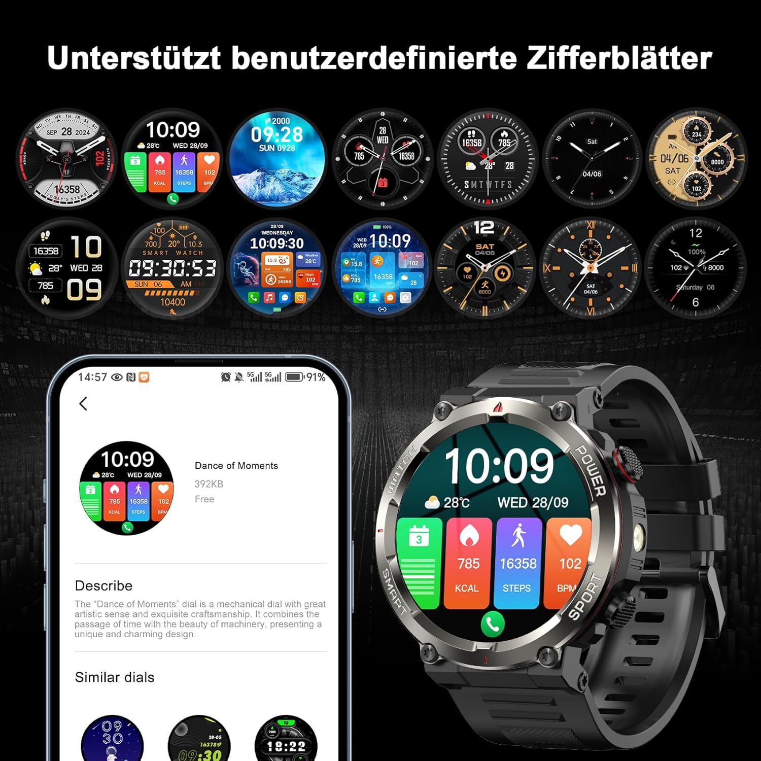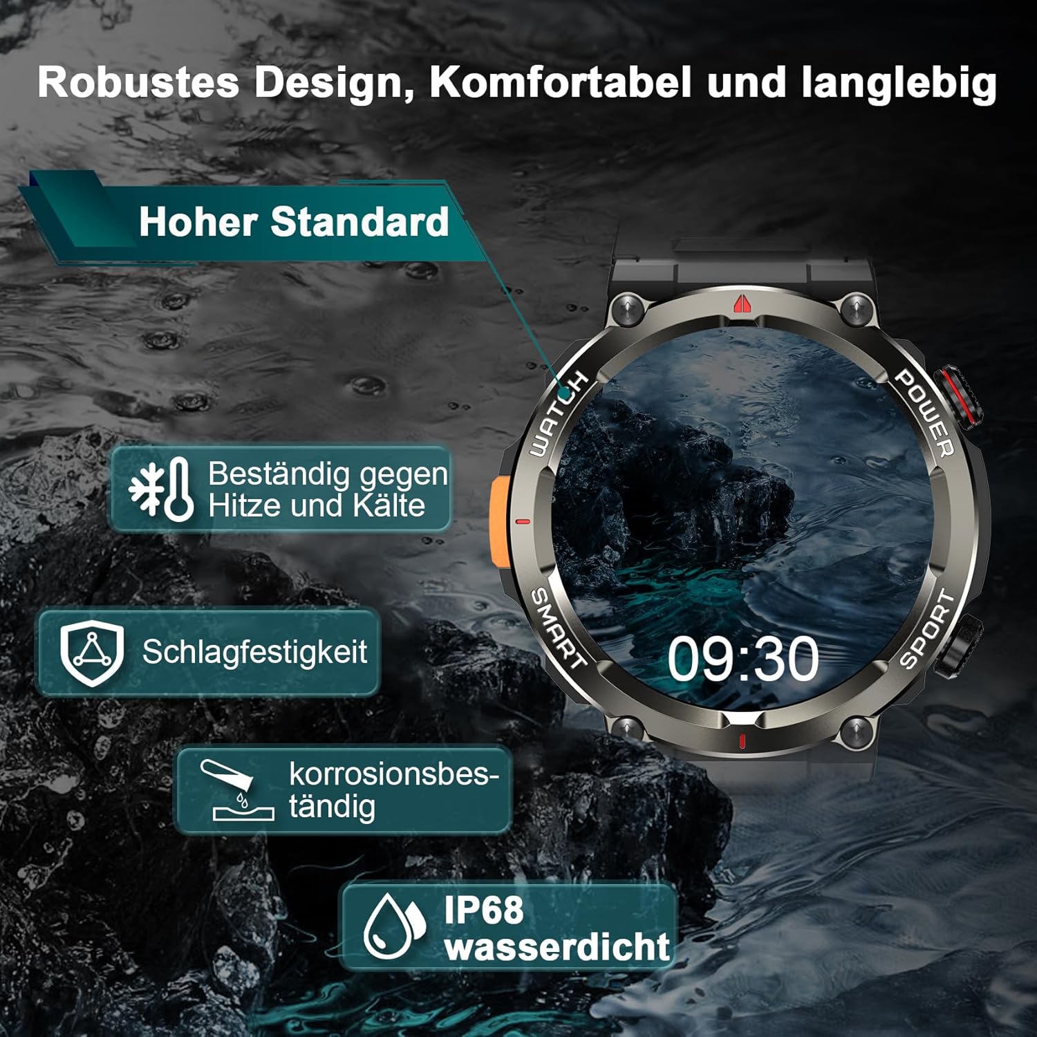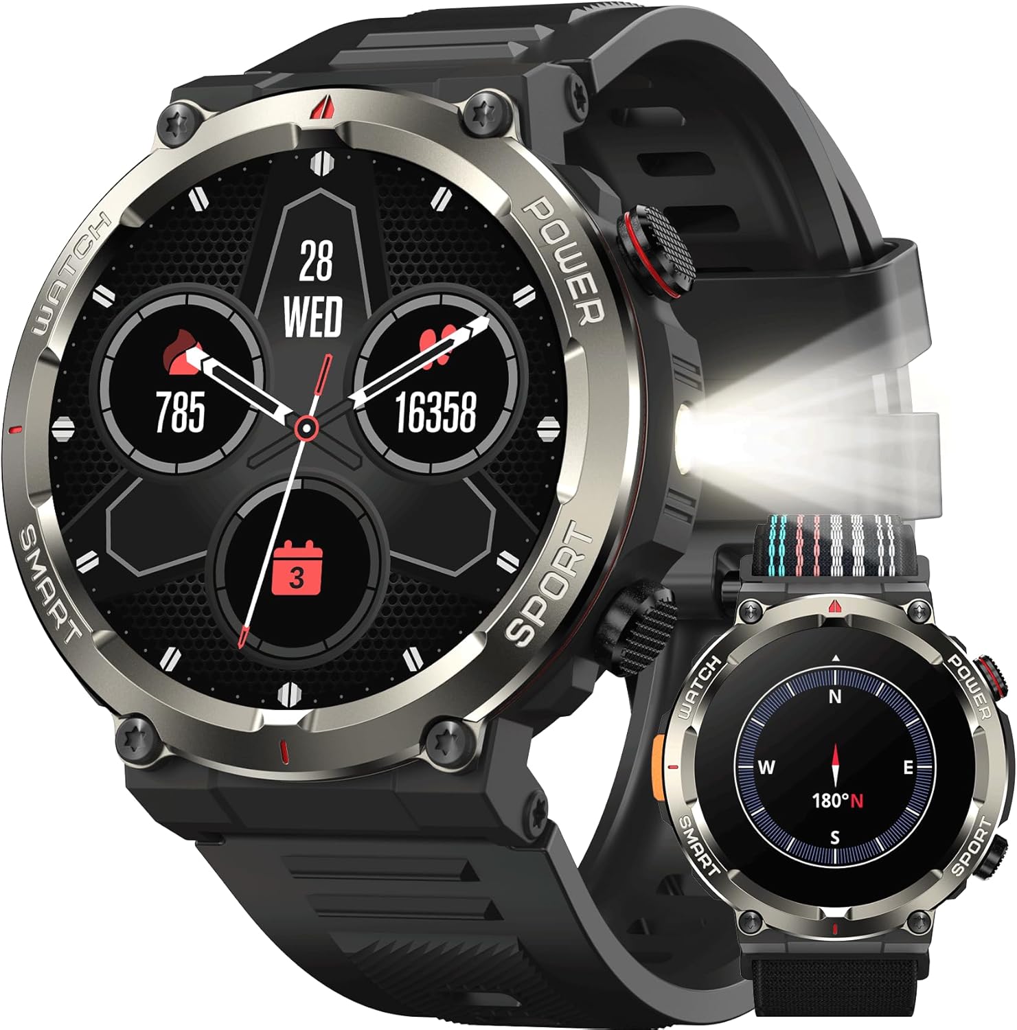 IOWODO Смарт часовник за мъже 2025 | 100-дневна батерия и осветление | IP68 водоустойчивост и компас | 1.45-инчов сензорен екран | Bluetooth разговори | 100+ спортни режима | Анализ на пулса и съня | За Android/iOS