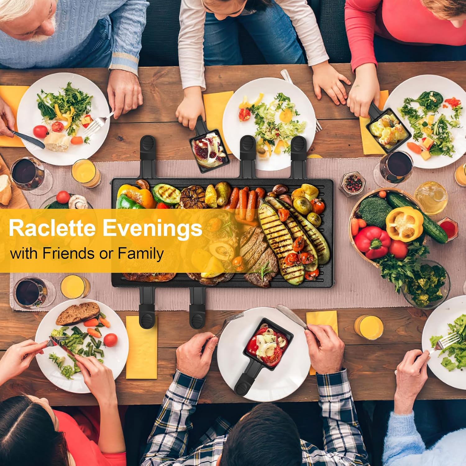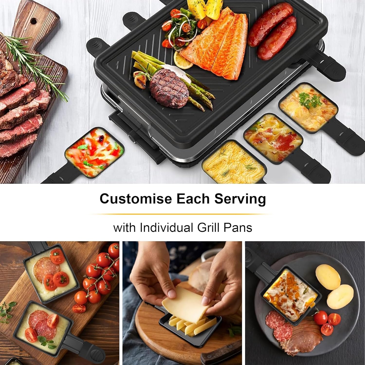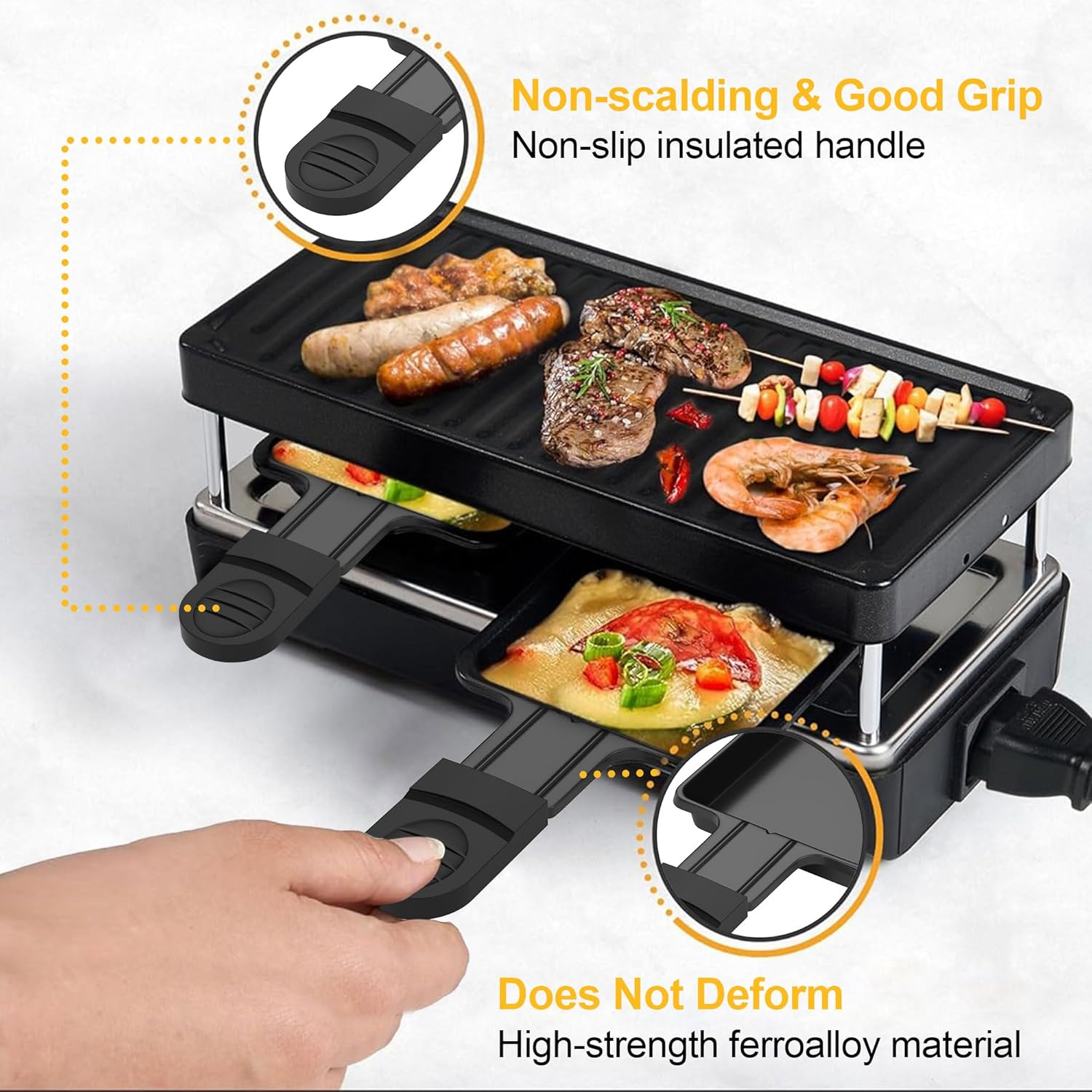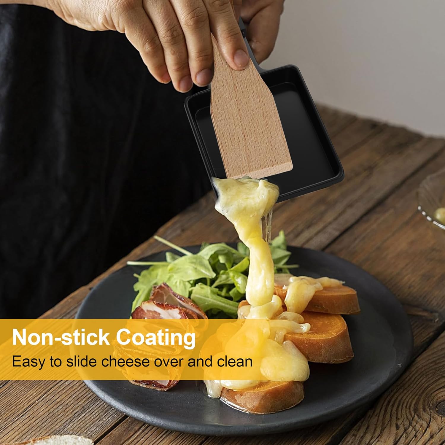 • ЛЕСНА УПОТРЕБА И ПОЧИСТВАНЕ Тиганът за раклет е с незалепващо покритие, което позволява на разтопеното сирене да се движи плавно, без да оставя следи. Благодарение на това покритие, чайниците могат лесно да се почистват на ръка (препоръчително) с мека гъба - без драскотини - или в съдомиялна машина. Това елиминира досадното почистване.