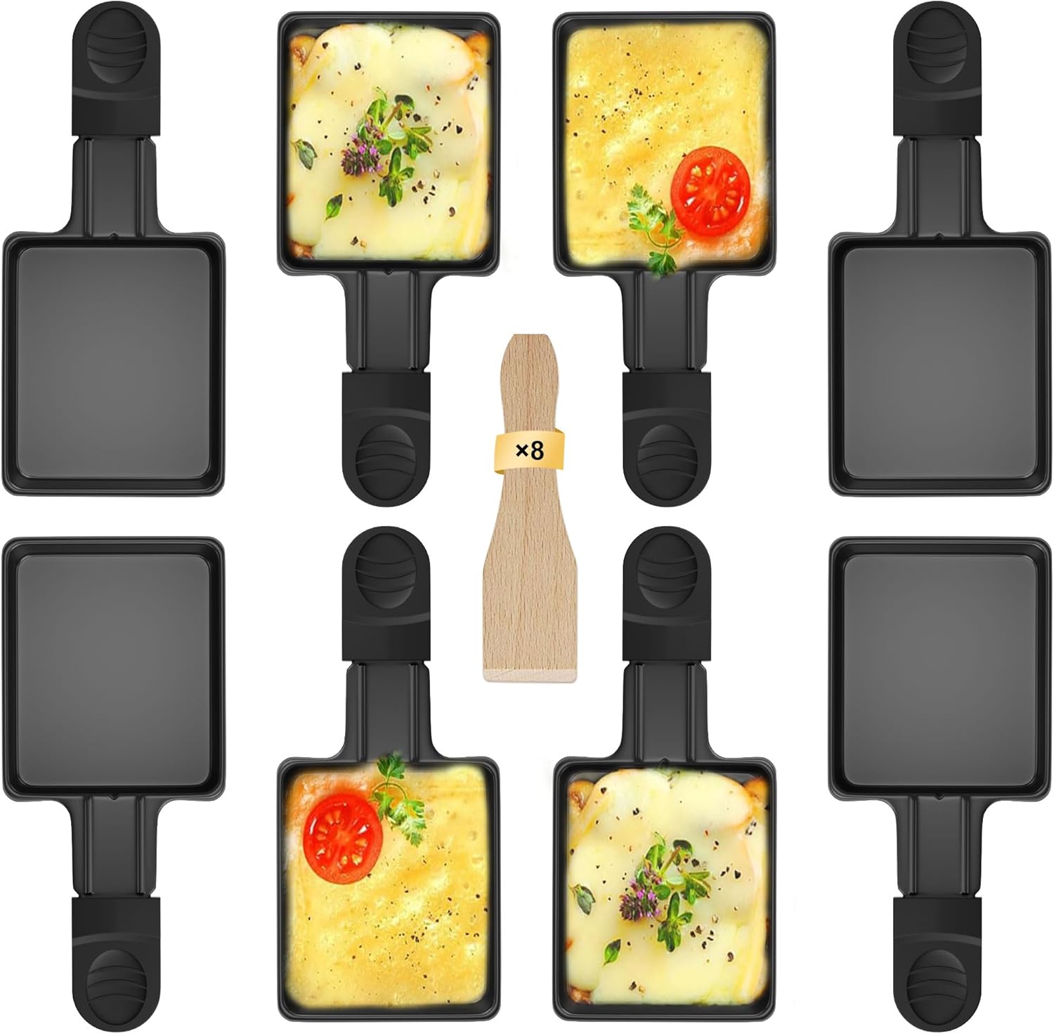 ipow тигани за раклет, пакет от 8, мини тигани за раклет, резервно незалепващо покритие за аксесоари за раклет с 4 дървени лъжички и изолирани дръжки