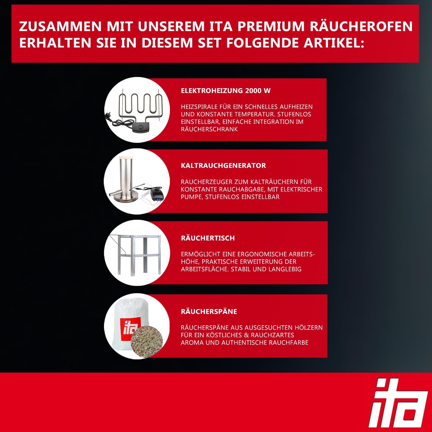 ITA Електрическа пушилня 7000, Комплект за пушене с нагревател, Маса, Генератор на дим, Шкаф за пушене с прозорец и термометър, Легирана стомана, Качество от ЕС, Директно от производителя