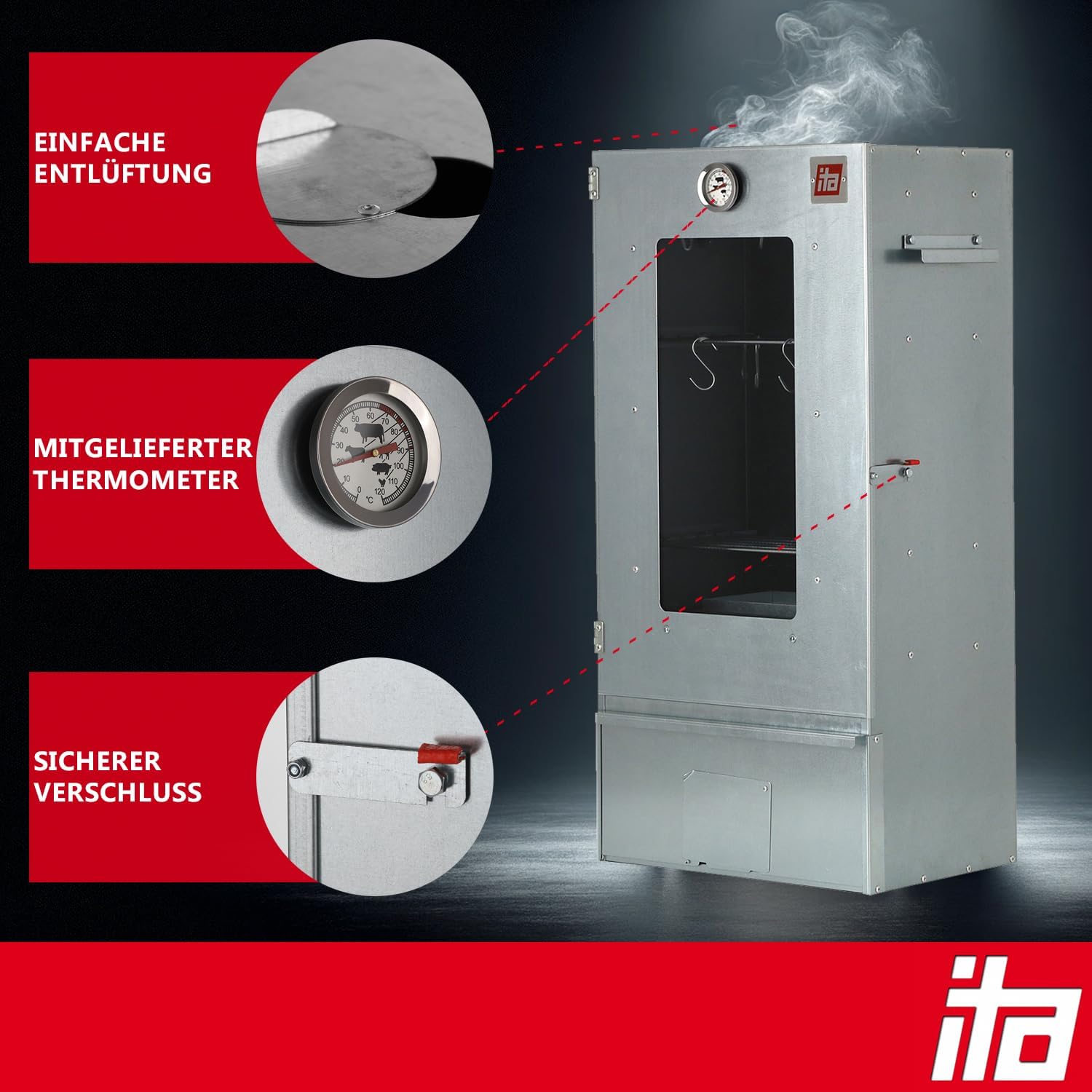 • Комфортно пушене: Този първокласен шкаф за пушене ITA с три нива е вашият нов партньор за интензивно опушване на месо, риба, сирене и зеленчуци, независимо дали са студено или горещо пушени.