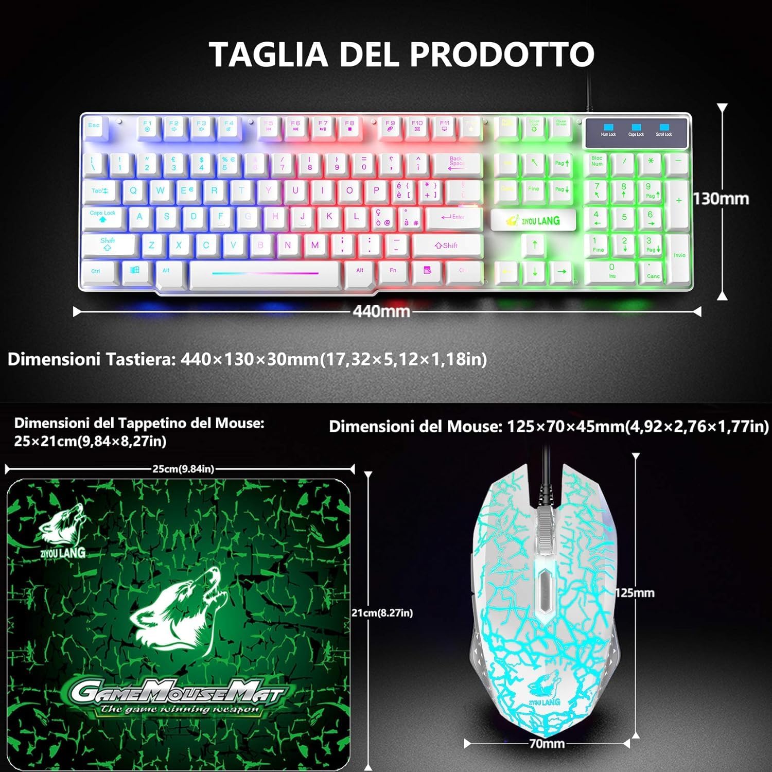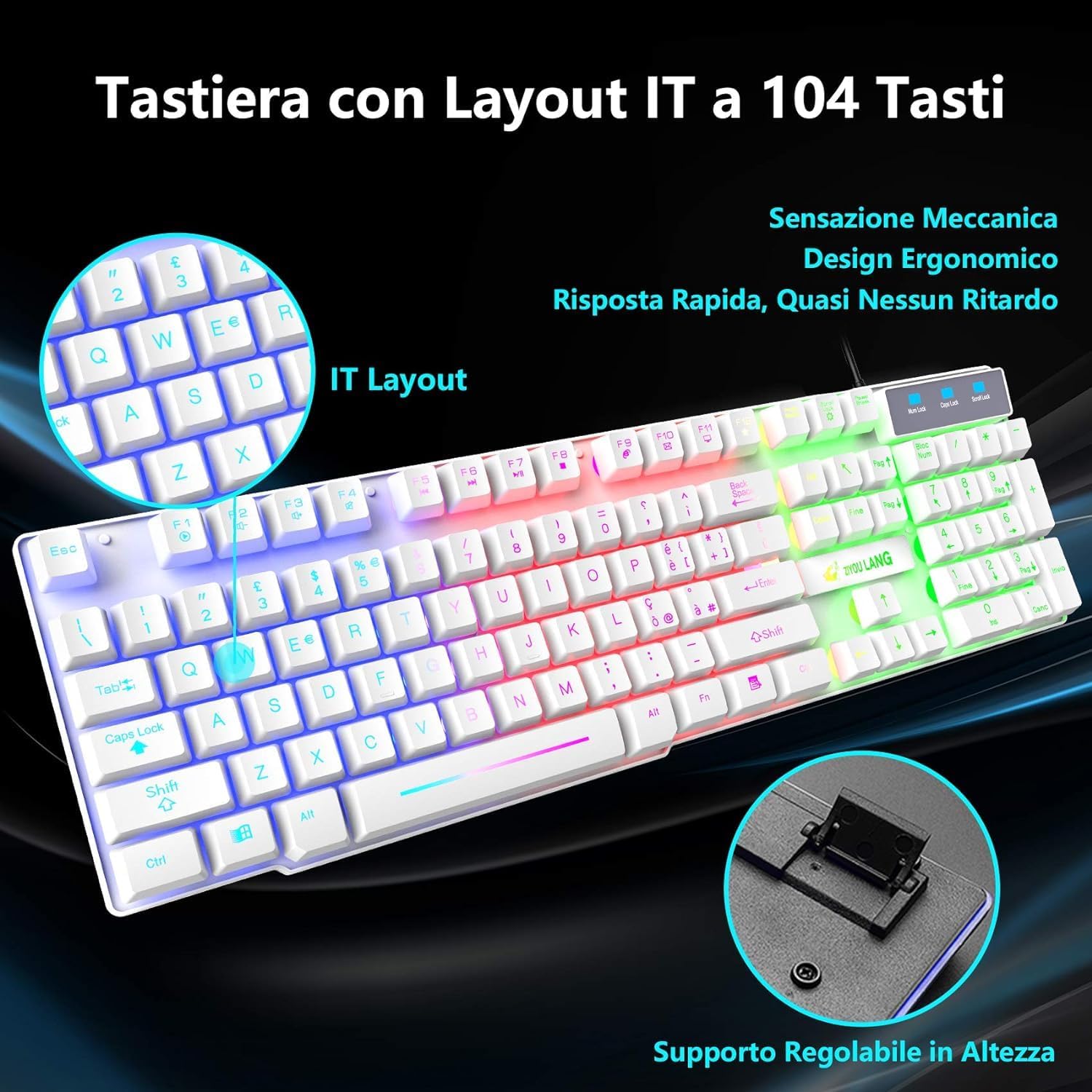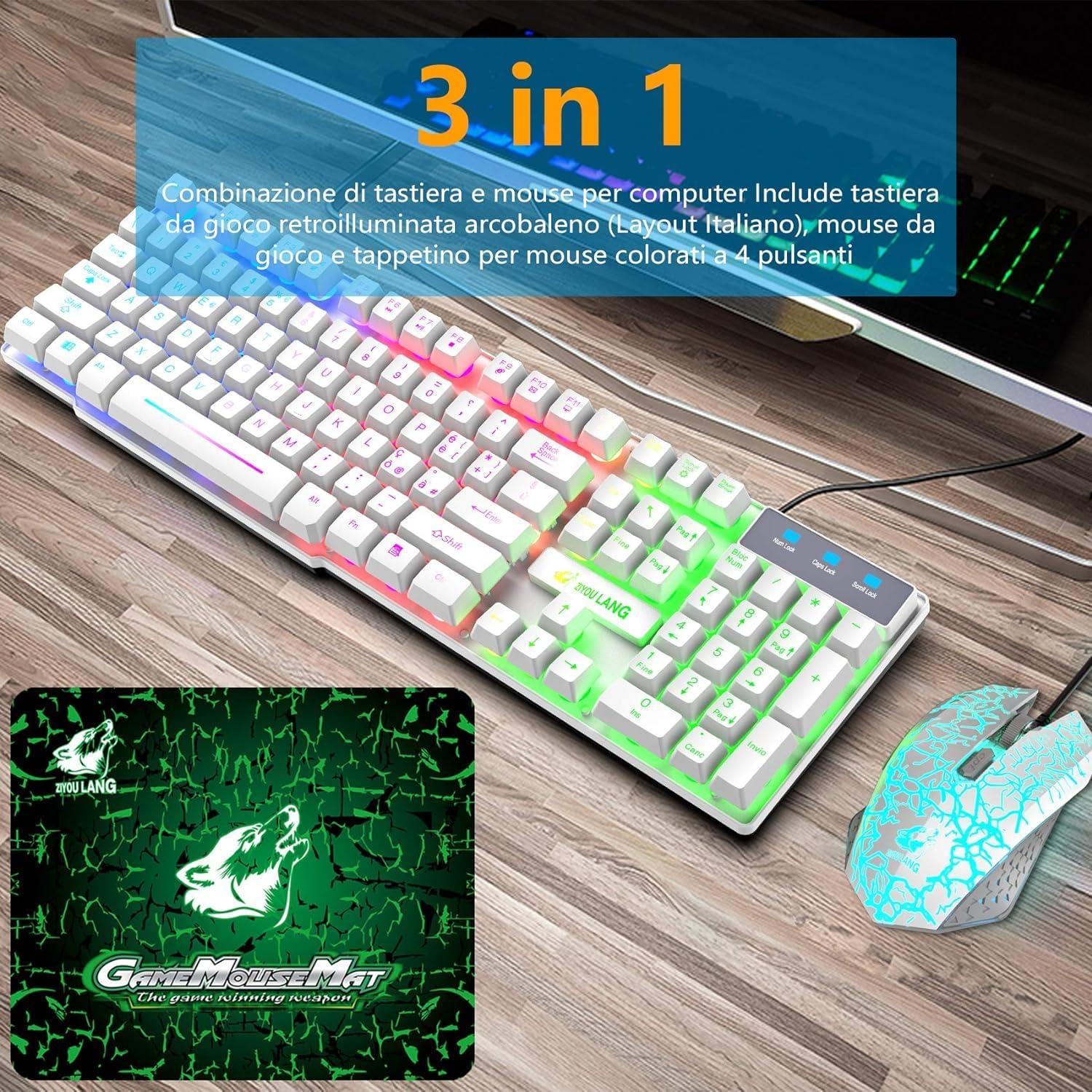 • Италианска QWERTY клавиатура и мишка: Геймърска клавиатура с LED подсветка в цветовете на дъгата, осигуряваща ви цветна атмосфера за писане и игра през нощта, специално проектираните клавиши могат да подобрят издръжливостта и тактилната обратна връзка. FN + Scroll Lock = Активиране/деактивиране на подсветката, FN + ≤/≈ = Увеличаване/намаляване на яркостта, FN + PrtSc SysRq = Активира режим на дишане, FN + / ^ = Увеличаване/намаляване на честотата на дишане.