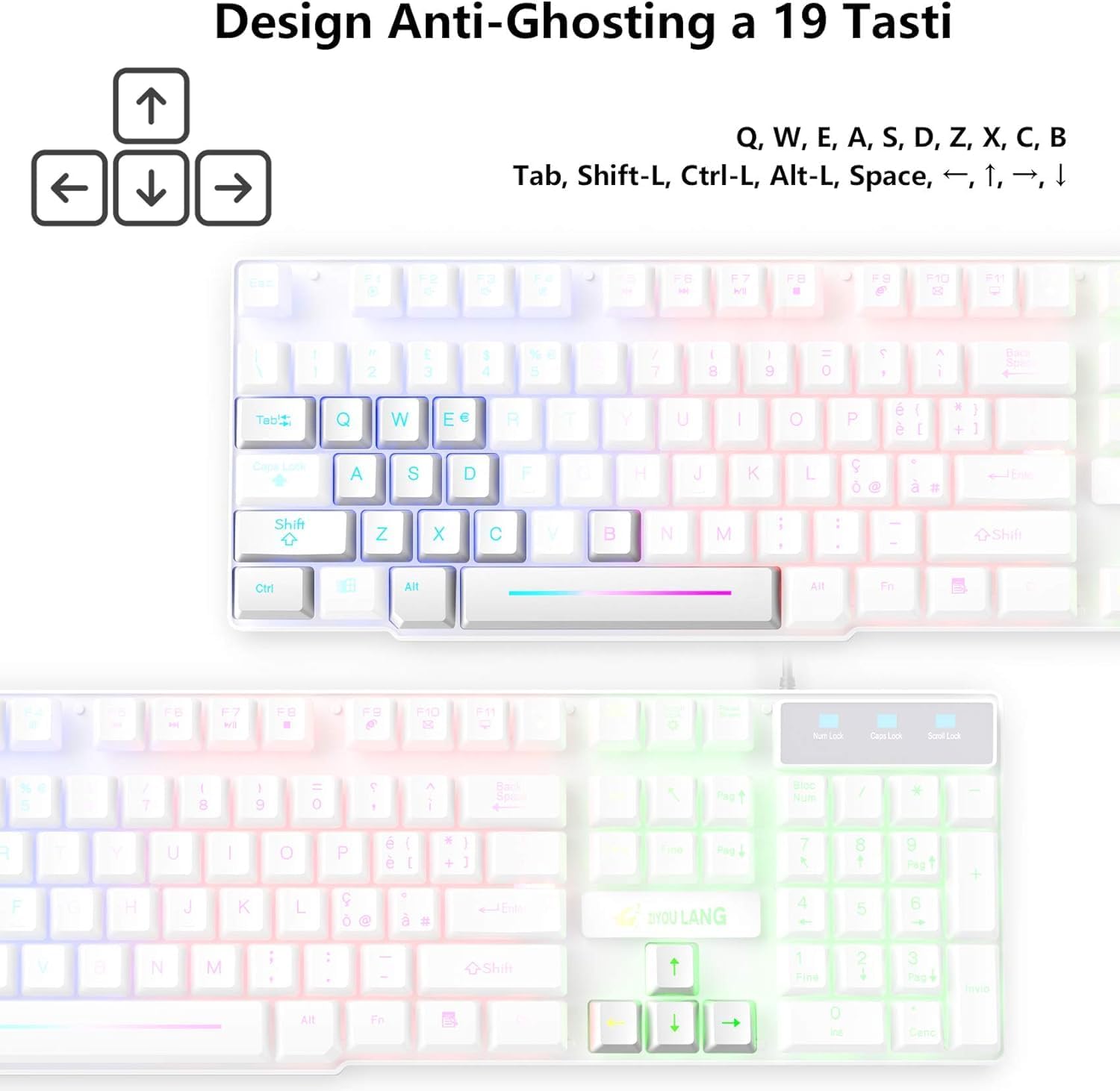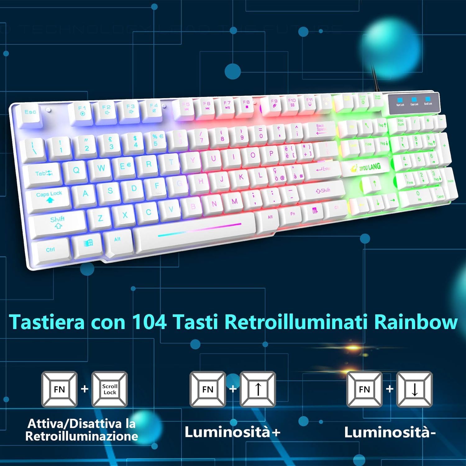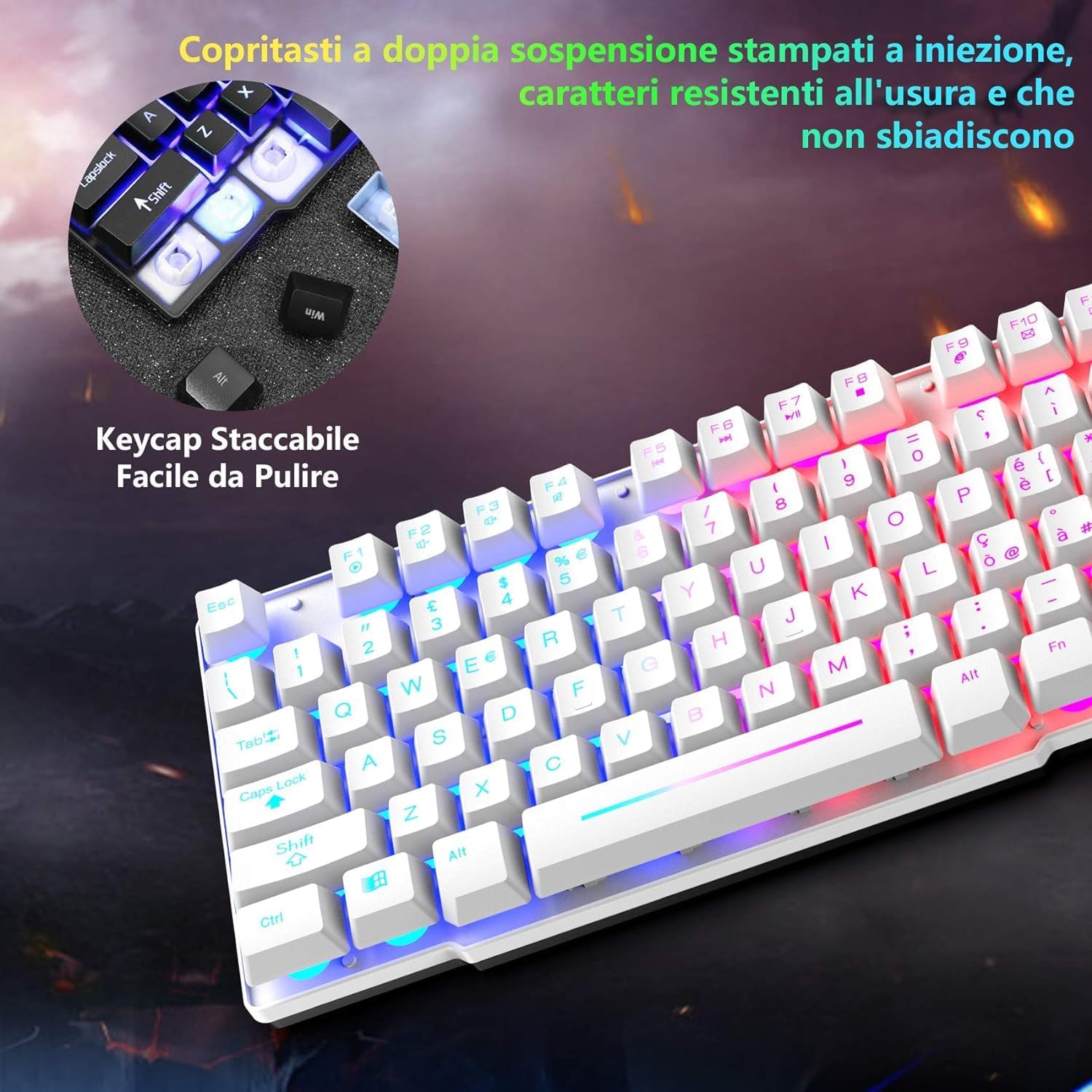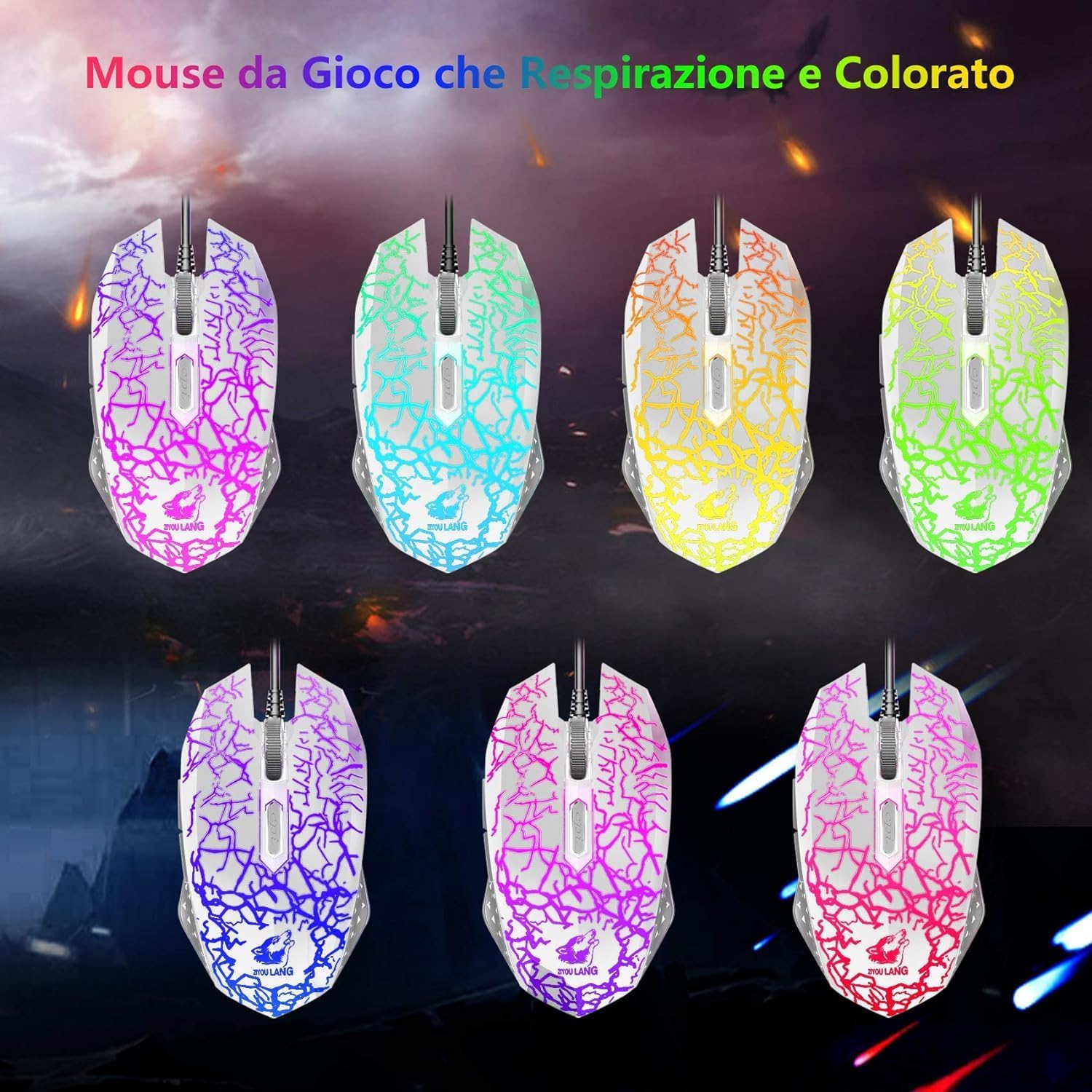• Италианска QWERTY клавиатура и мишка: Геймърска клавиатура с LED подсветка в цветовете на дъгата, осигуряваща ви цветна атмосфера за писане и игра през нощта, специално проектираните клавиши могат да подобрят издръжливостта и тактилната обратна връзка. FN + Scroll Lock = Активиране/деактивиране на подсветката, FN + ≤/≈ = Увеличаване/намаляване на яркостта, FN + PrtSc SysRq = Активира режим на дишане, FN + / ^ = Увеличаване/намаляване на честотата на дишане.