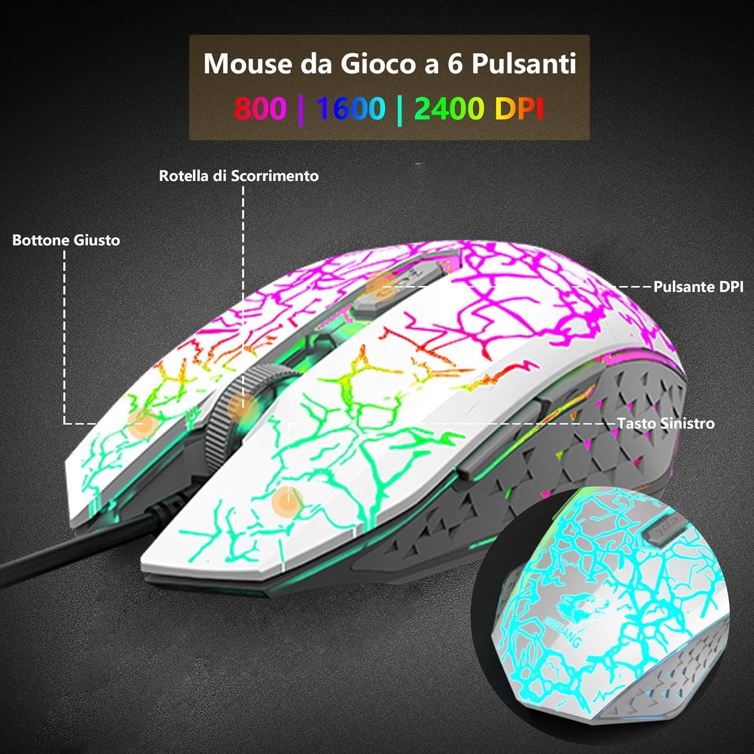 • ГЕЙМЪРСКА МИШКА С 4 НИВО НА DPI - 7 светлинни цвята, невероятни светлинни ефекти, неплъзгащ се дизайн, ергономичен дизайн. 800dpi / 1600dpi / 2000dpi / 2400dpi, многоцветен дишащ светлинен ефект, ергономичен дизайн: приляга естествено на ръката ви. 6 бутона за превъзходна ефективност и комфорт.