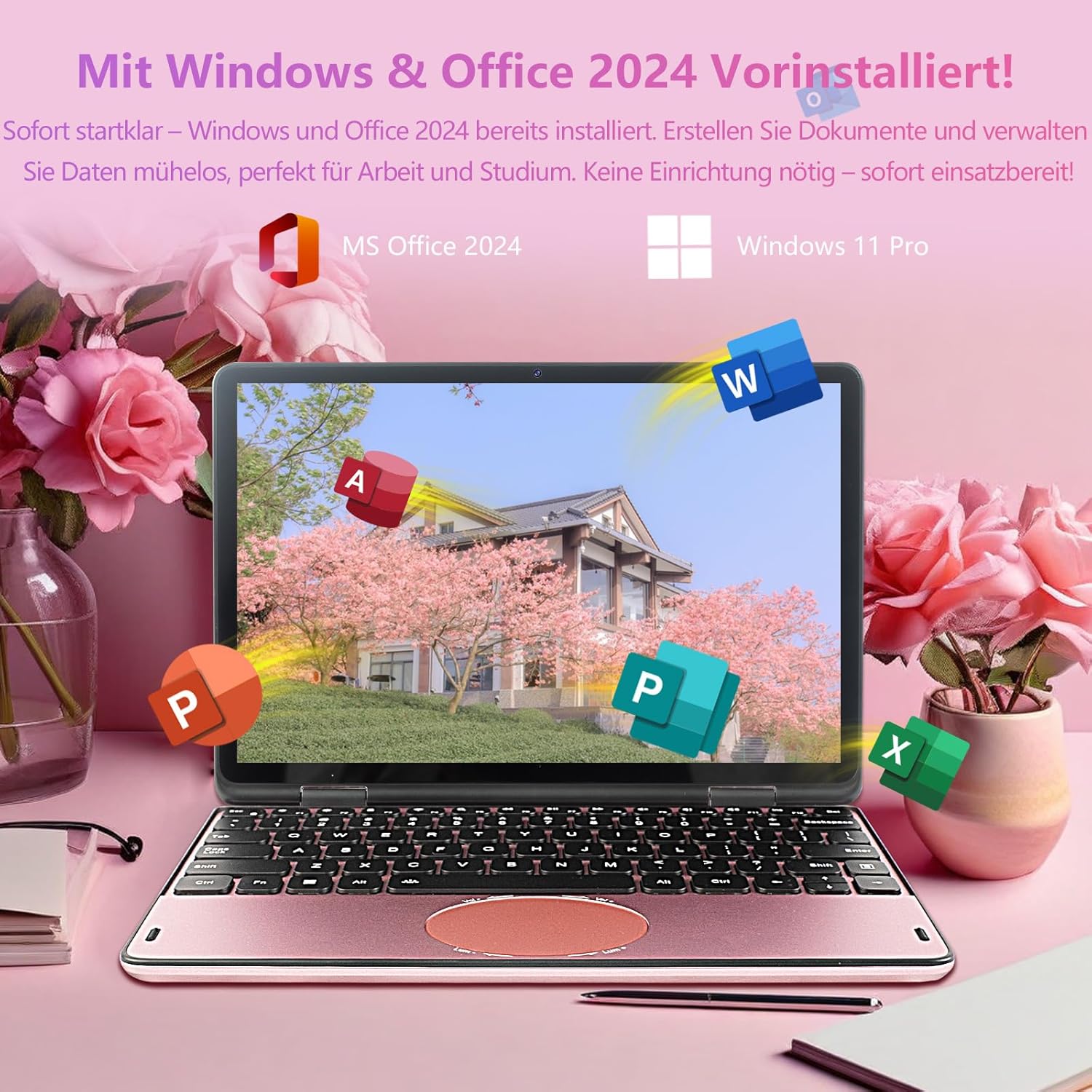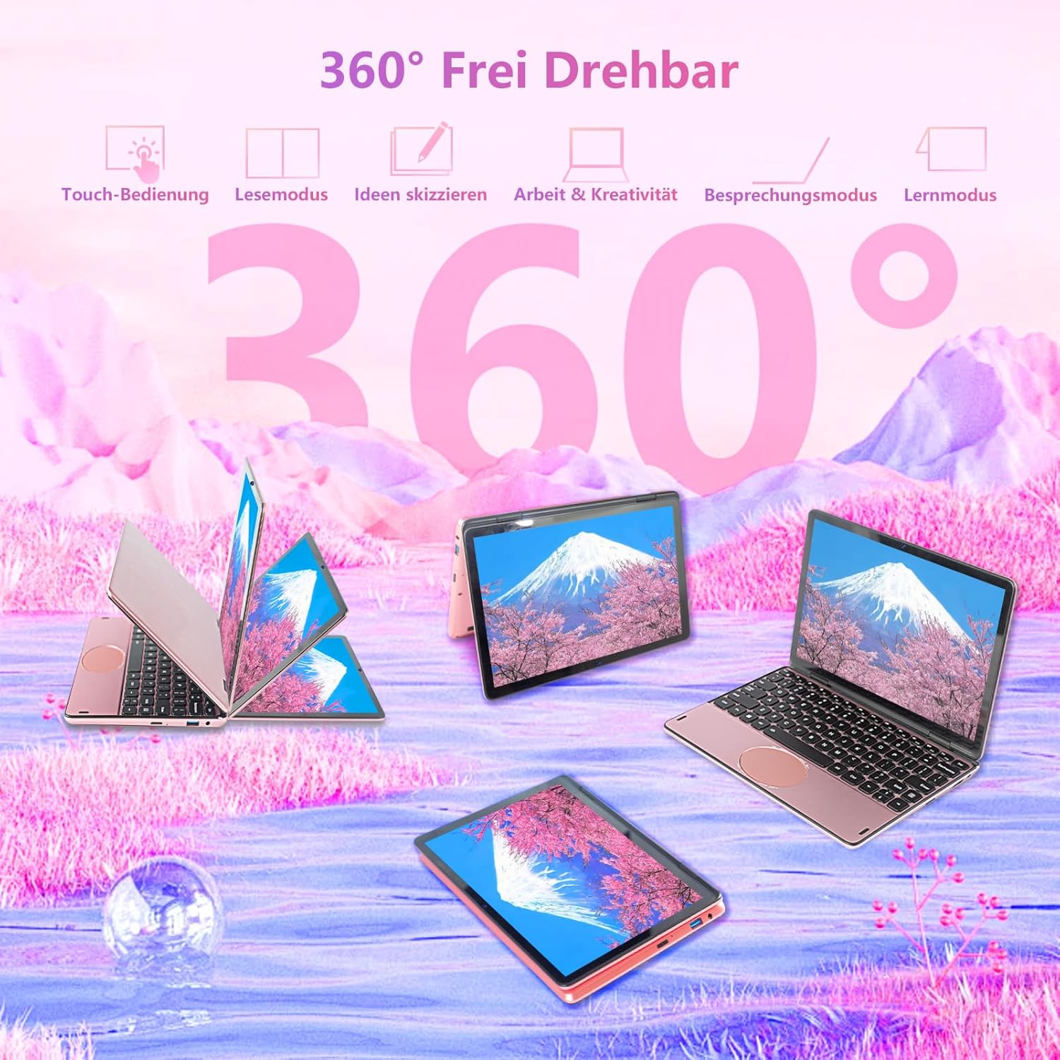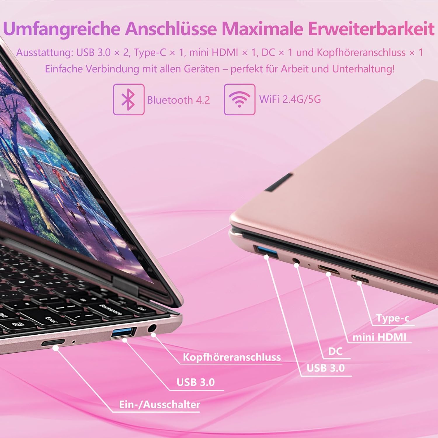 IUGNG 10.95-инчов 2-в-1 лаптоп с тъчскрийн, Yoga N100 лаптоп с 360° въртящ се на 360°, 1920 x 1200 IPS, 16GB DDR4, 256GB SSD, клавиатура с подсветка (розово злато, 256)