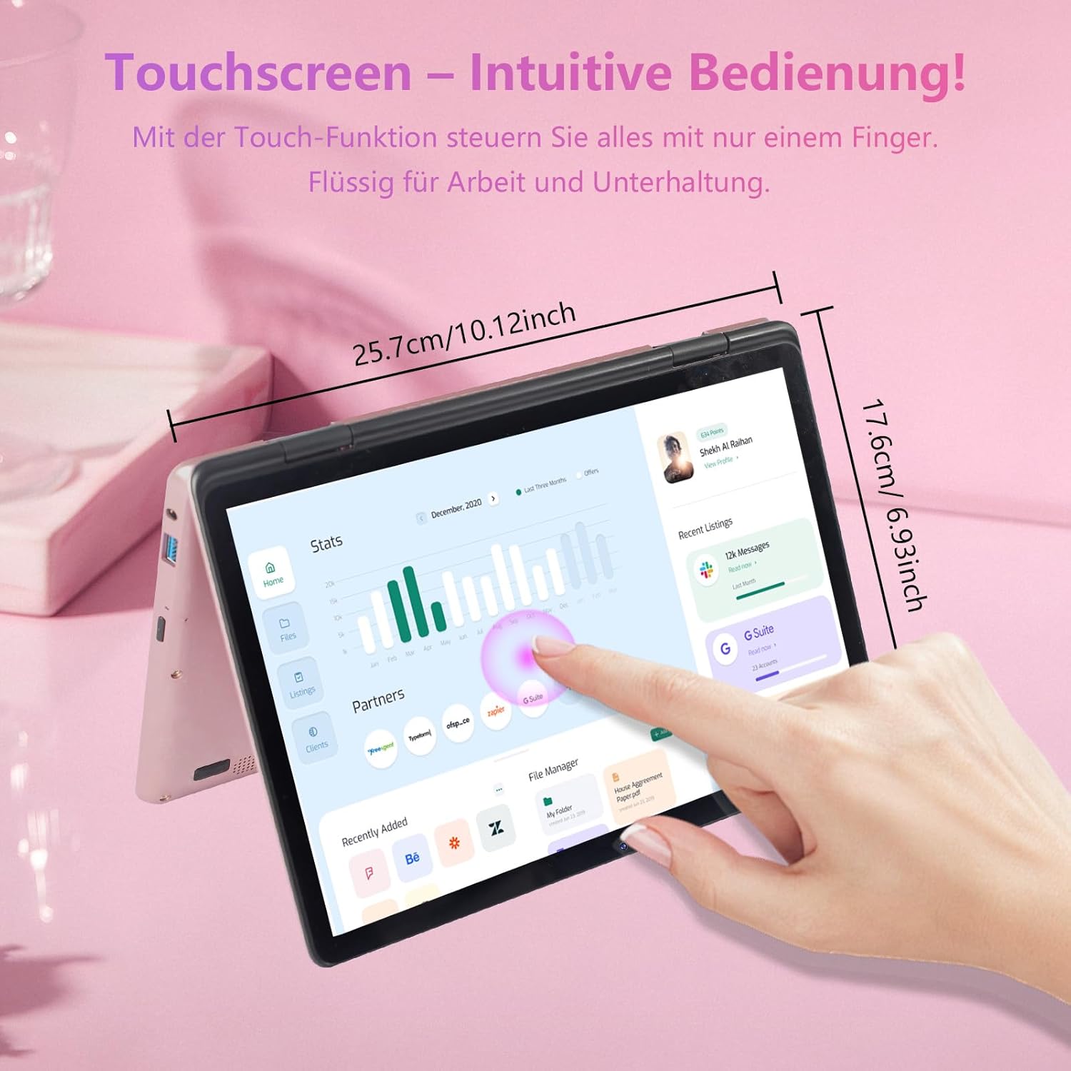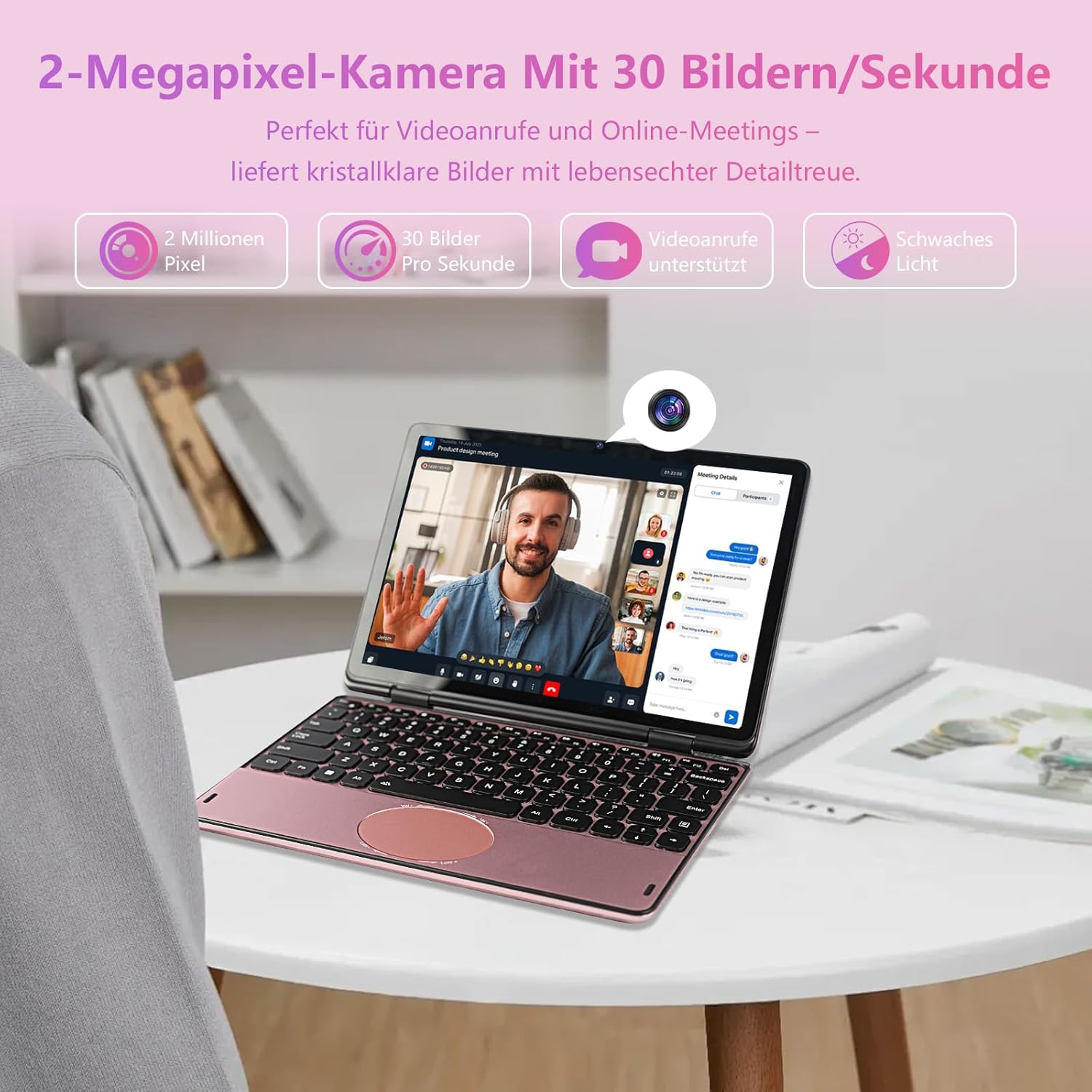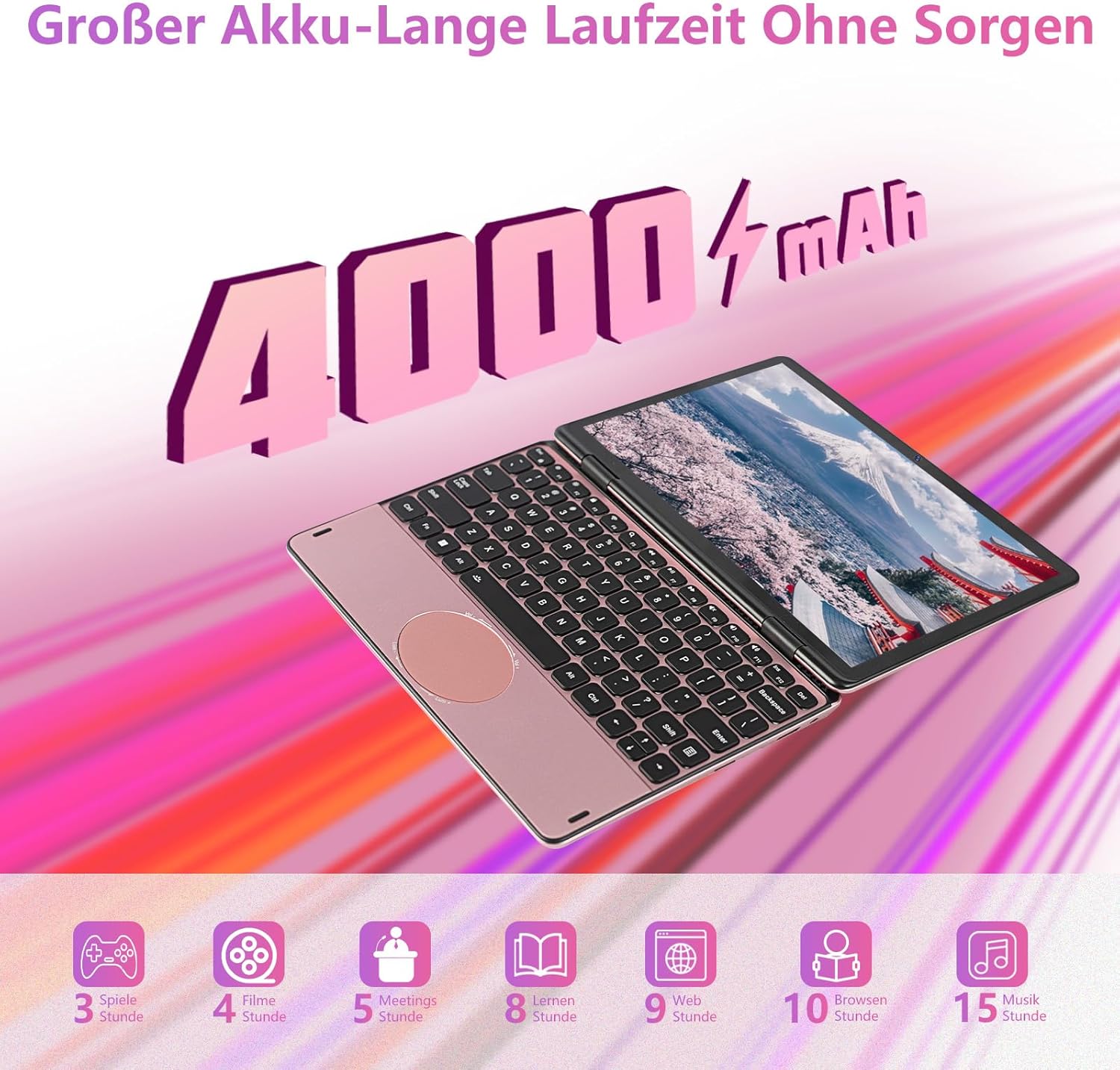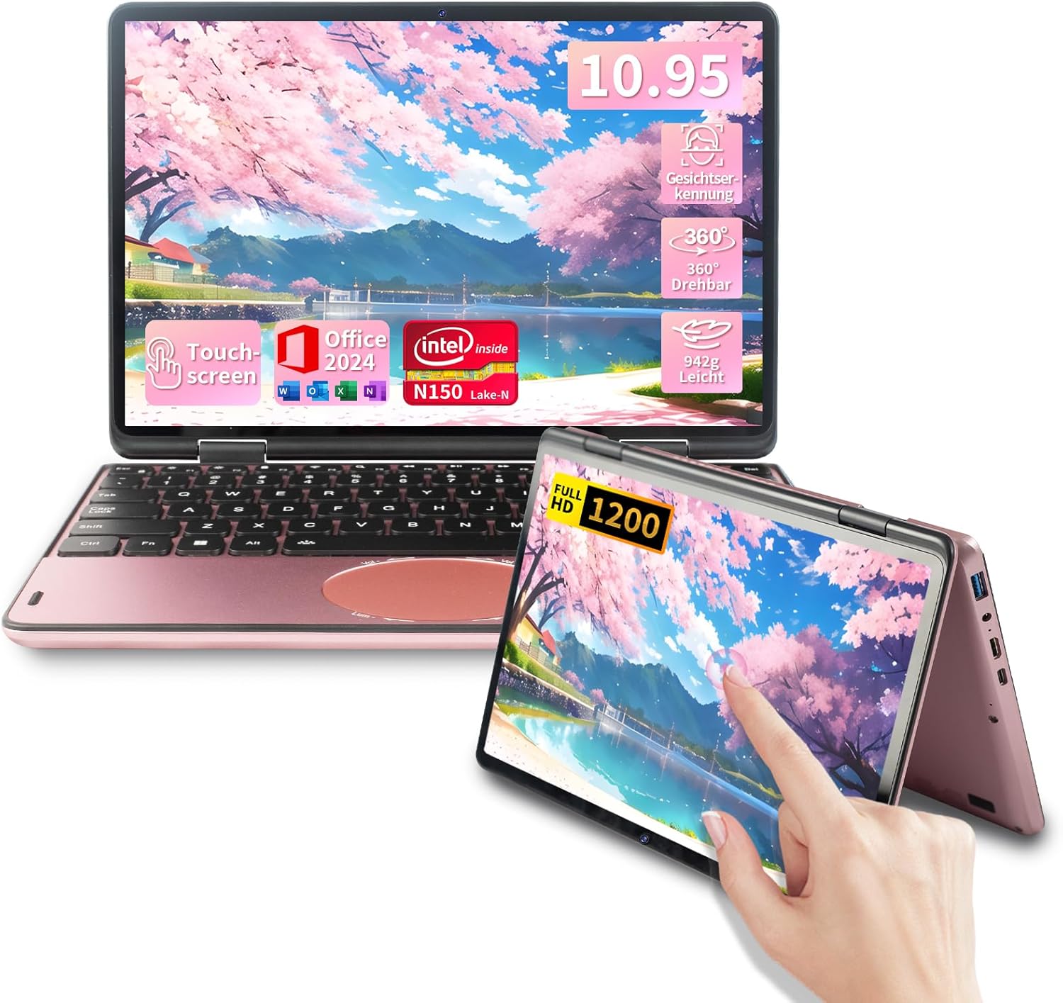 IUGNG 10.95-инчов 2-в-1 лаптоп с тъчскрийн, Yoga N100 лаптоп с 360° въртящ се на 360°, 1920 x 1200 IPS, 16GB DDR4, 256GB SSD, клавиатура с подсветка (розово злато, 256)