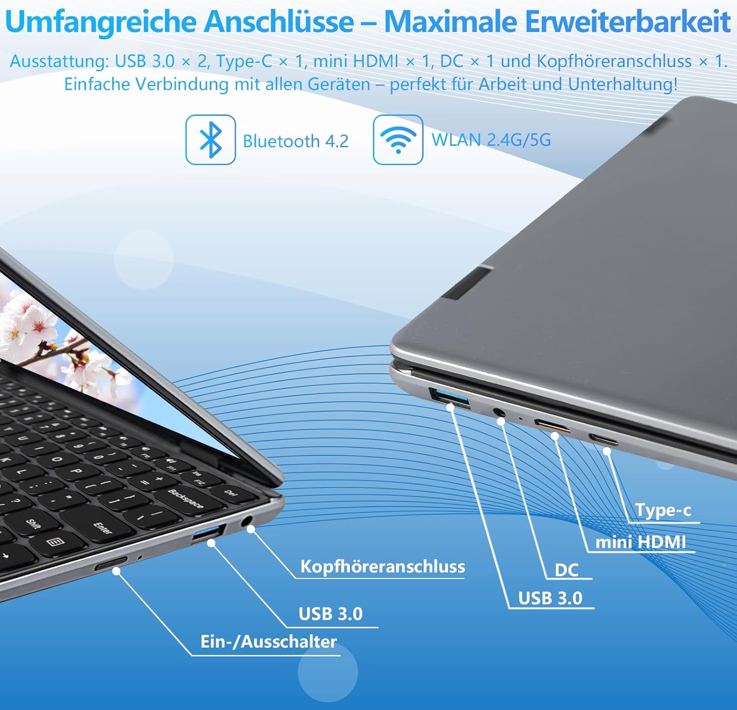 • HD камера и многофункционален тъчпад: Този лаптоп осигурява стабилна и бърза WiFi връзка чрез двубандов WiFi (2.4G/5G) и Bluetooth 4.2. Оборудван е с 2-мегапикселова HD камера, която поддържа плавни видео разговори с 30 кадъра в секунда. Вградените USB 3.0, Type-C и Mini HDMI портове, както и други интерфейси, отговарят на вашите нужди от разширение. Уникалният овален тъчпад поддържа управление на силата на звука и яркостта с жестове. Пакетът включва немско фолио за клавиатура, безжична мишка и ръководство за употреба (английският език не е гарантиран). Той е идеалният избор за домашен офис, мобилен офис и онлайн обучение.