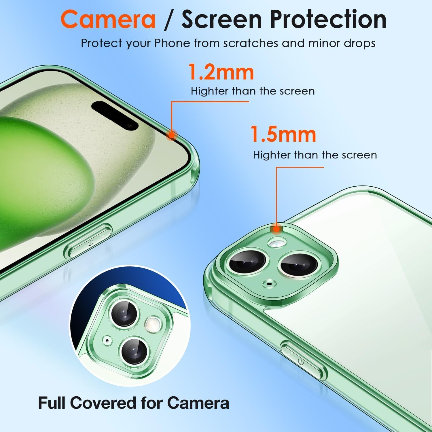 • [Повишена защита на камерата и екрана] --- Камерата и екранът са двете най-скъпи и крехки части на целия телефон. Повдигнатите ръбове около предния екран и обектива на камерата могат ефективно да се справят с последиците от внезапно падане или удар, без да надраскат красивия ви телефон.