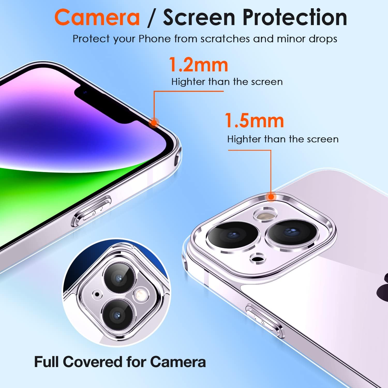 • [Повишена защита на камерата и екрана] --- Камерата и екранът са двете най-скъпи и крехки части на целия телефон. Повдигнатите ръбове около предния екран и обектива на камерата могат ефективно да се справят с последиците от внезапно падане или удар, без да надраскат красивия ви телефон.