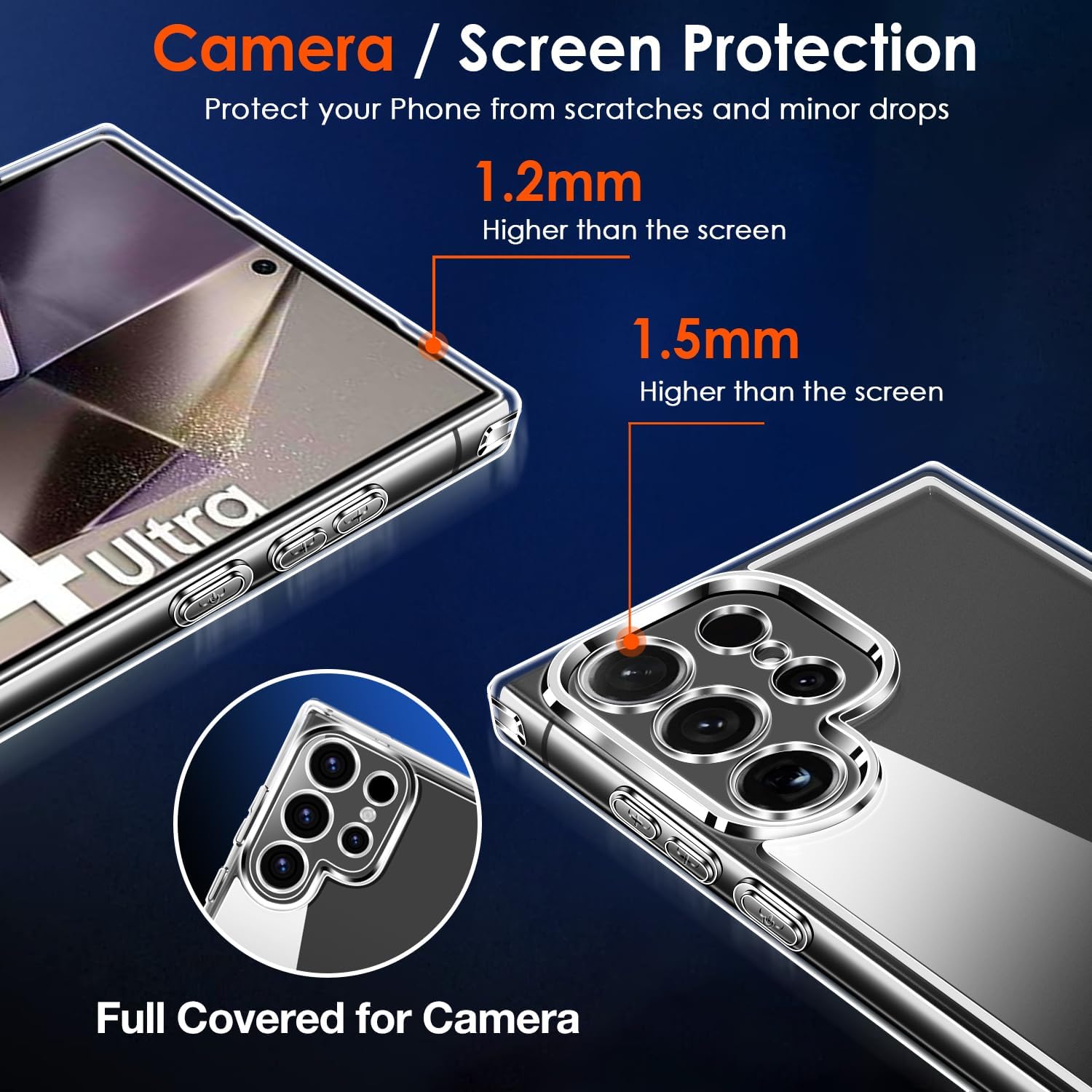 • [Повишена защита на камерата и екрана] --- Камерата и екранът са двете най-скъпи и крехки части на целия телефон. Повдигнатите ръбове около предния екран и обектива на камерата могат ефективно да се справят с последиците от внезапно падане или удар, без да надраскат красивия ви телефон!