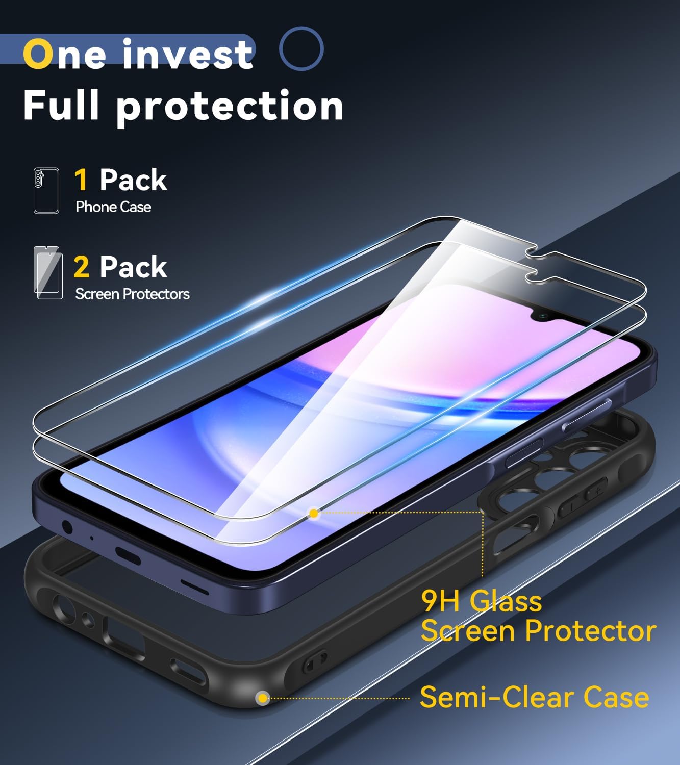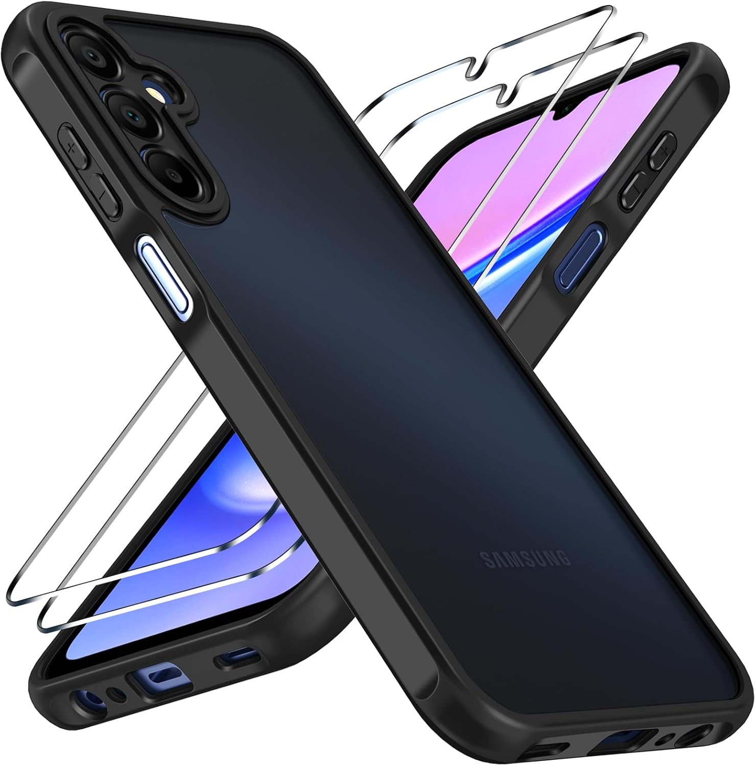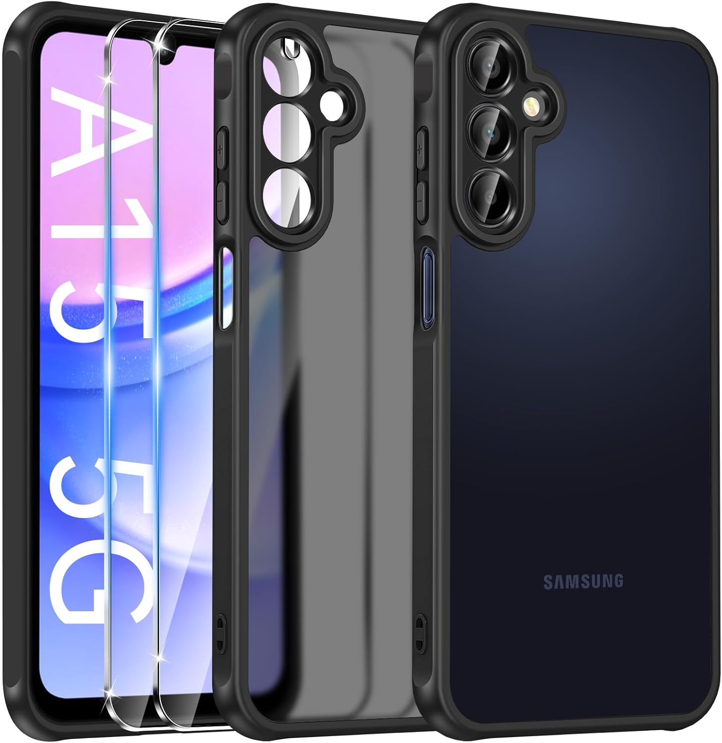 iVoler калъф за Samsung Galaxy A15 4G / 5G с 2 части защита от закалено стъкло, военен стандарт, удароустойчив, защита на камерата, калъф за мобилен телефон, матов прозрачен гръб, защита срещу пръстови отпечатъци