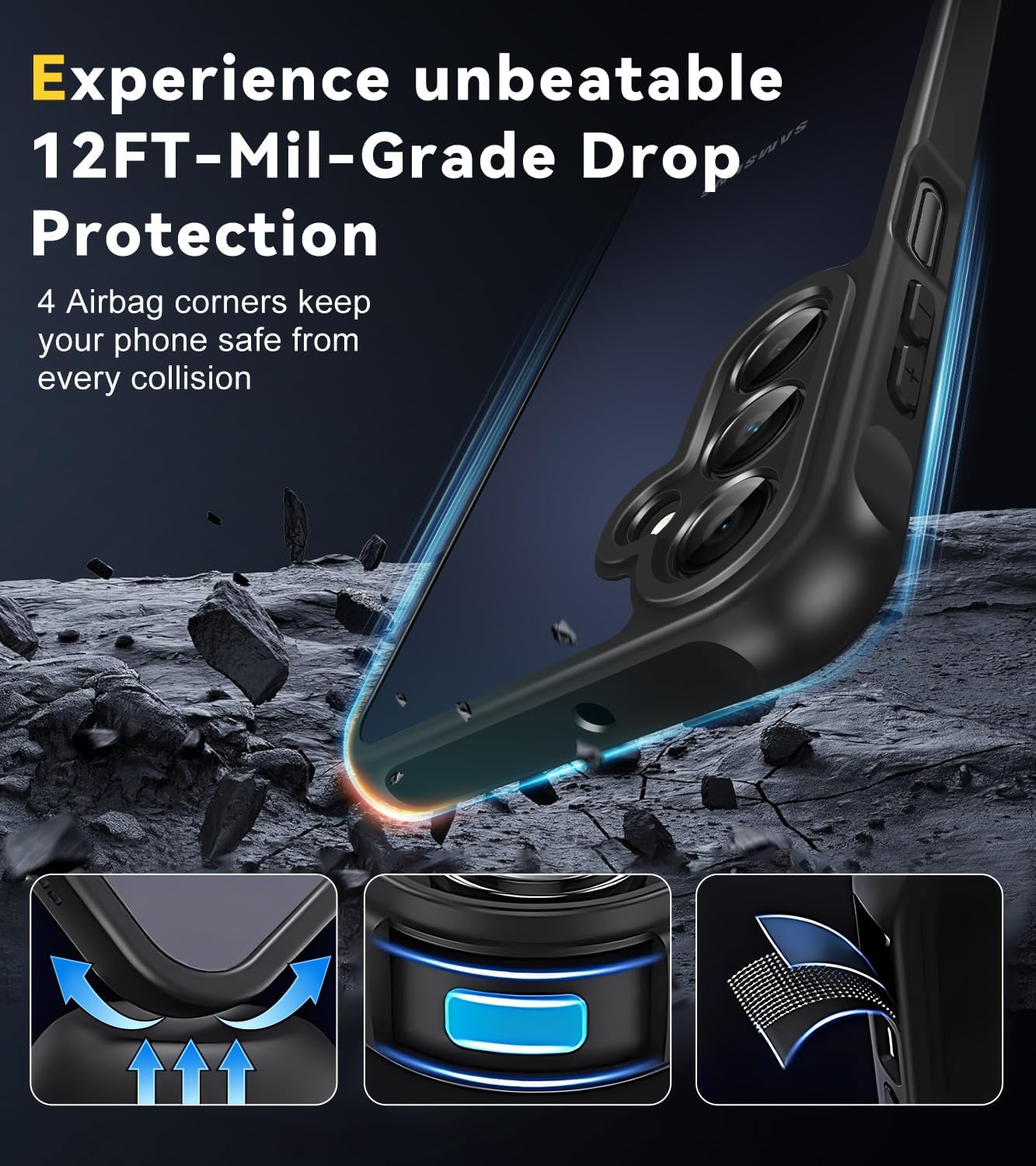 • 【Отлична защита от военно ниво】Твърдата PC задна плоча обгражда мека TPU броня с абсорбиращи ударите "въздушни възглавници" в 4 ъгъла, които могат ефективно да абсорбират и разпределят 99,99% от удара при падане. Тестван да издържа на реални ситуации, включително тестове за падане от множество ъгли от 3 метра и екстремни надрасквания. Така телефонът ви е защитен от скъпи и досадни ремонти.