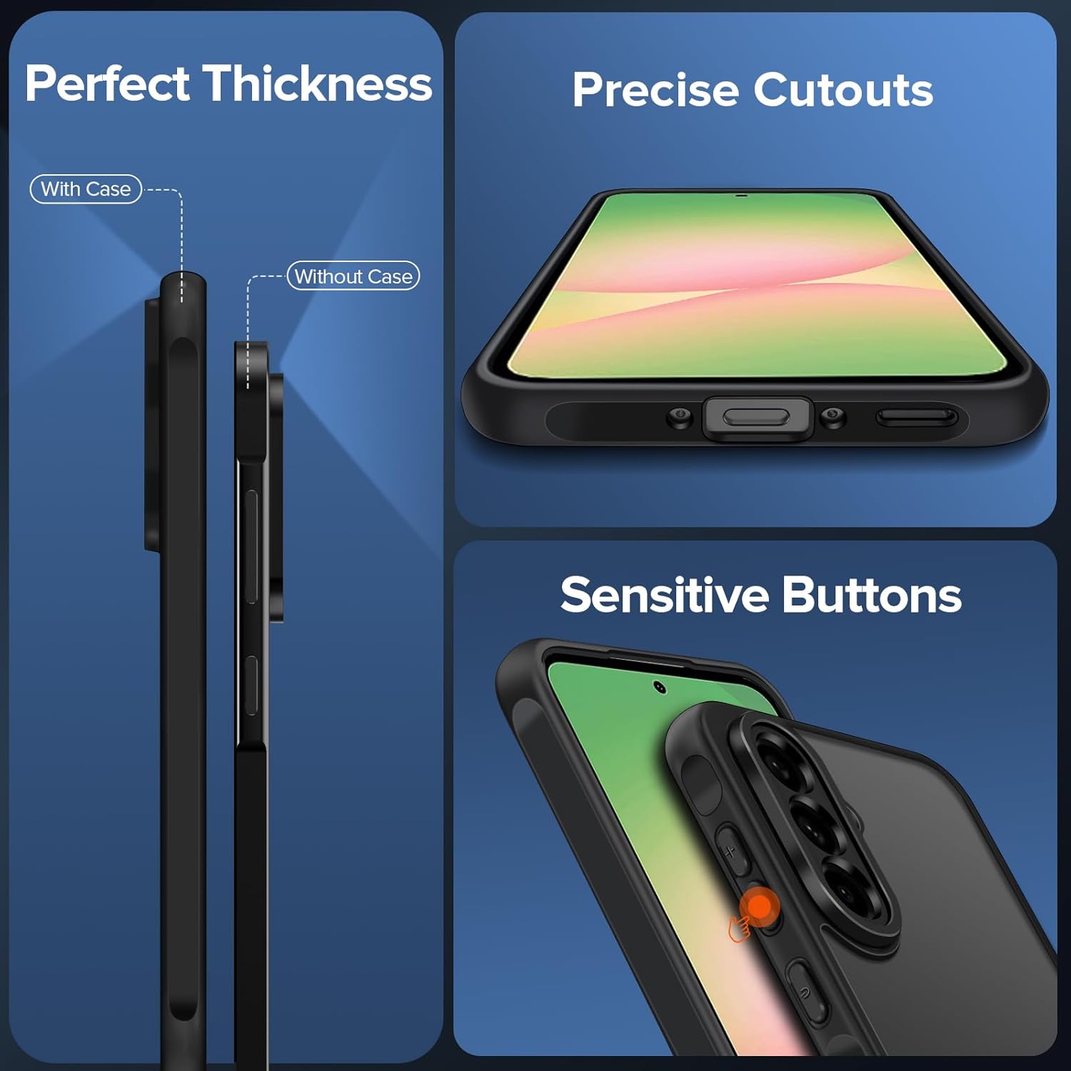 • 【Прецизни изрези】Калъф за Samsung Galaxy A16 5G с прецизно изрязване, лесен достъп до бутони, високоговорители, камери, интерфейс за зареждане, за да се осигури по-добра чувствителност. Простият и елегантен дизайн на калъфа предлага гладко, плътно прилягане до кожата и максимално дълготрайна производителност.