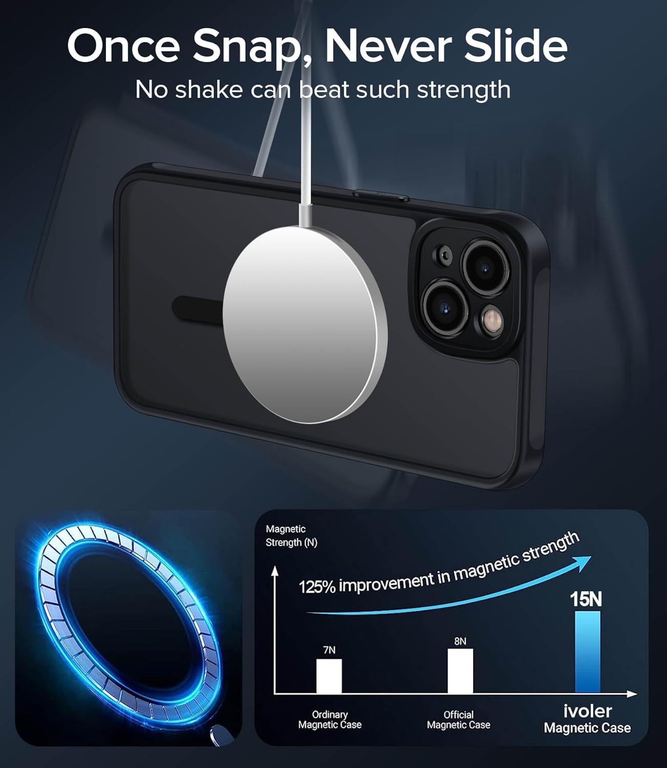 • Силна магнитна адсорбция: ексклузивният, патентован магнит Halbach, който е два пъти по-силен от официалния магнитен калъф-яйце. Този магнитен калъф е съвместим с всички Qi сертифицирани магнитни зарядни устройства, магнитни портфейли и държачи за кола. С вградени магнити, които се подравняват перфектно с iPhone, калъфът се държи лесно и осигурява по-бързо безжично зареждане.