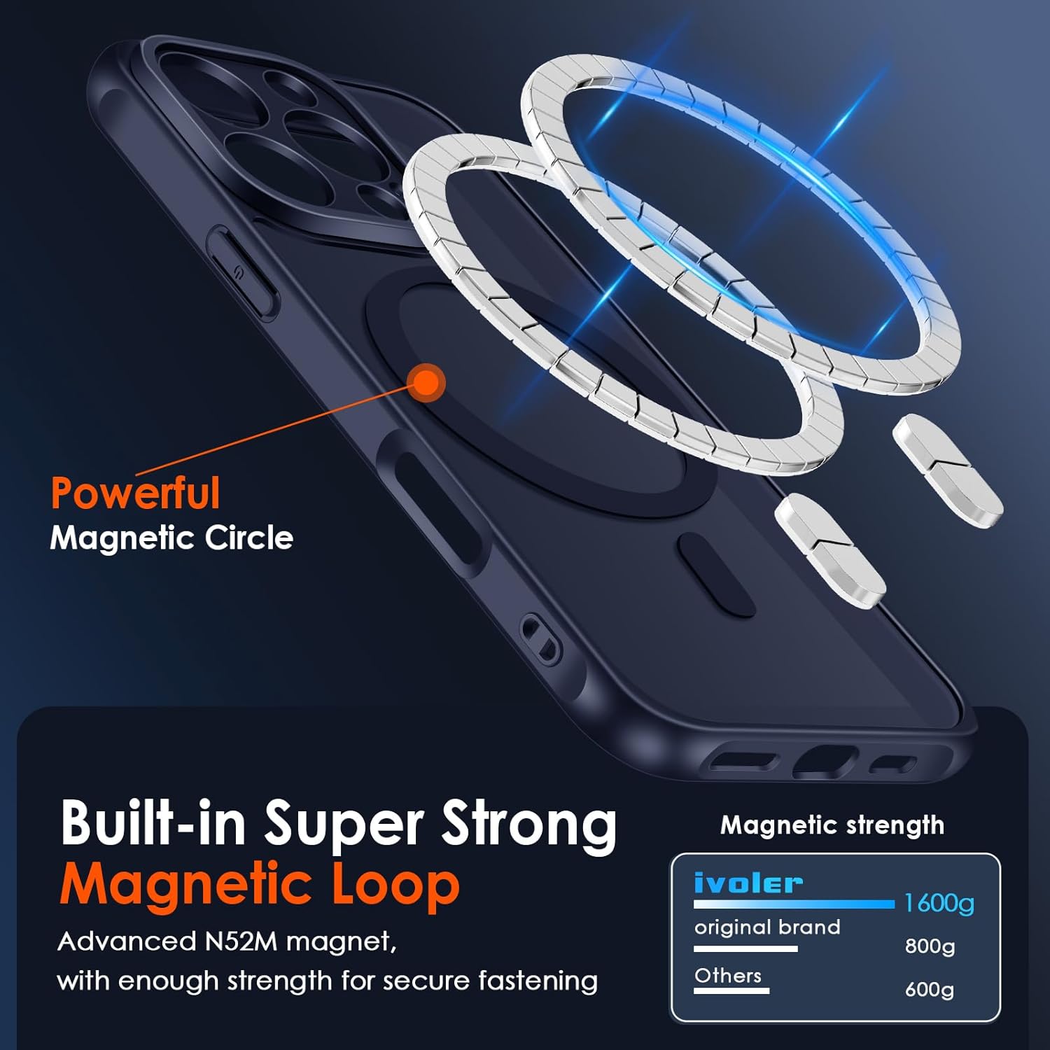 • Силна магнитна адсорбция: ексклузивният, патентован магнит Halbach, който е два пъти по-силен от официалния магнитен калъф-яйце. Този магнитен калъф е съвместим с всички Qi сертифицирани магнитни зарядни устройства, магнитни портфейли и държачи за кола. С вградени магнити, които се подравняват перфектно с iPhone, калъфът се държи лесно и осигурява по-бързо безжично зареждане.