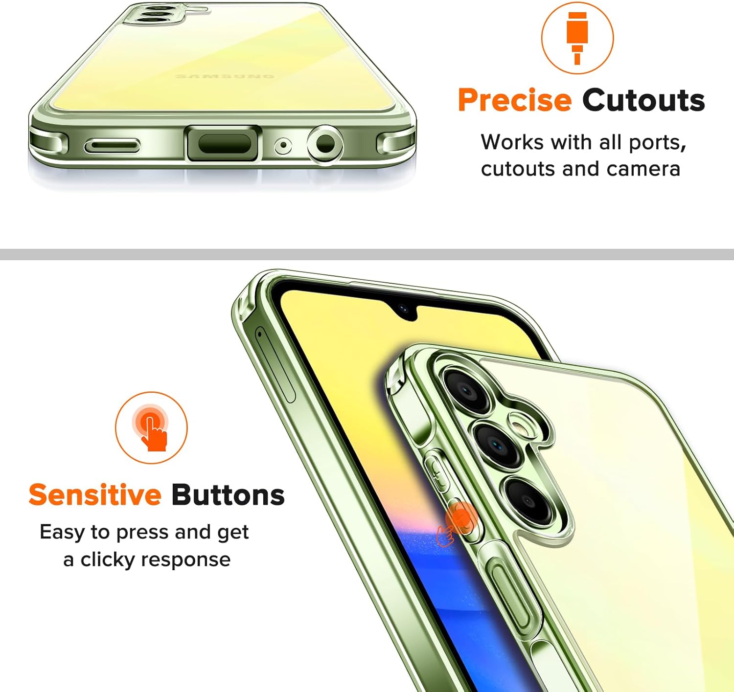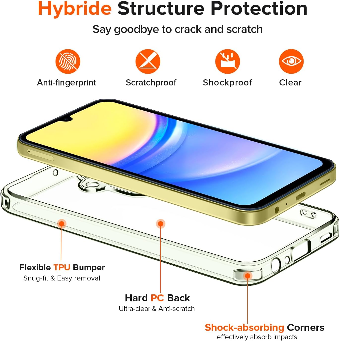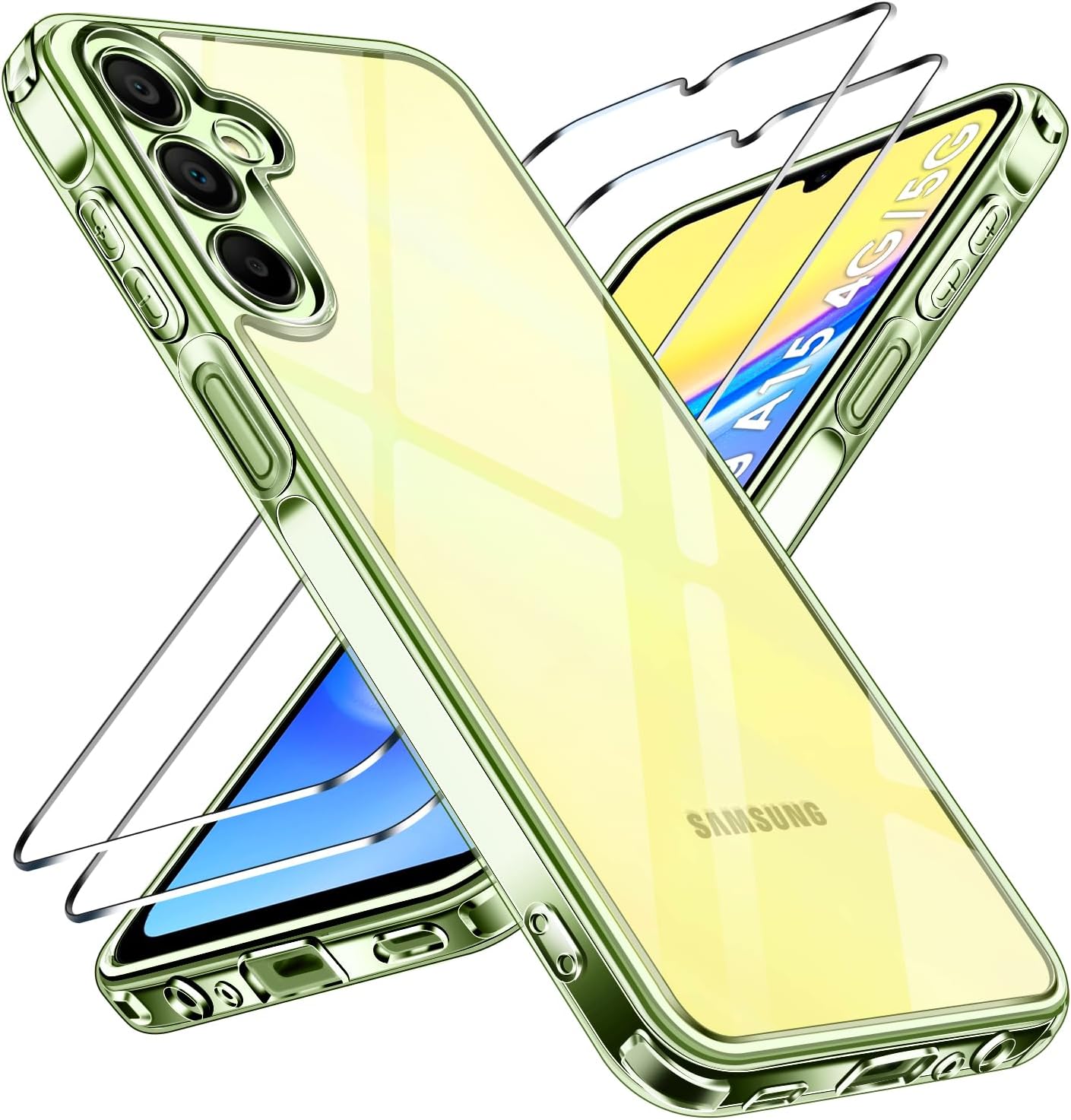 iVoler Непожълтяващ Прозрачен Мобилен Калъф за Samsung Galaxy A15 4G/A15 5G, с 2 Части Защита от Закалено Стъкло, Военна Защита, Тънък Удароустойчив Прозрачен Защитен Калъф (Жълт)
