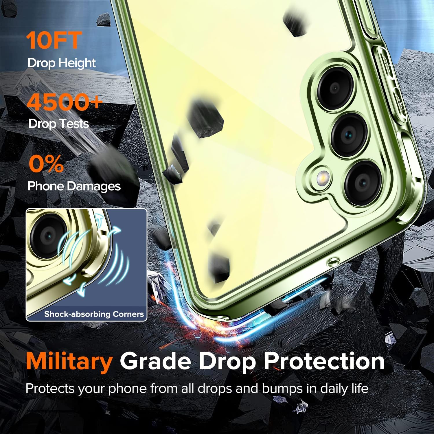 • Отлична защита от военно ниво: твърд PC заден панел обгражда мека TPU броня с абсорбиращи ударите „въздушни възглавници“ в 4 ъгъла, които могат ефективно да абсорбират и разпределят 99,99% от удара при падане. Тестван да издържа на реални ситуации, включително тестове за падане от множество ъгли от 3 метра и екстремни надрасквания. Така телефонът ви е защитен от скъпи и досадни ремонти.