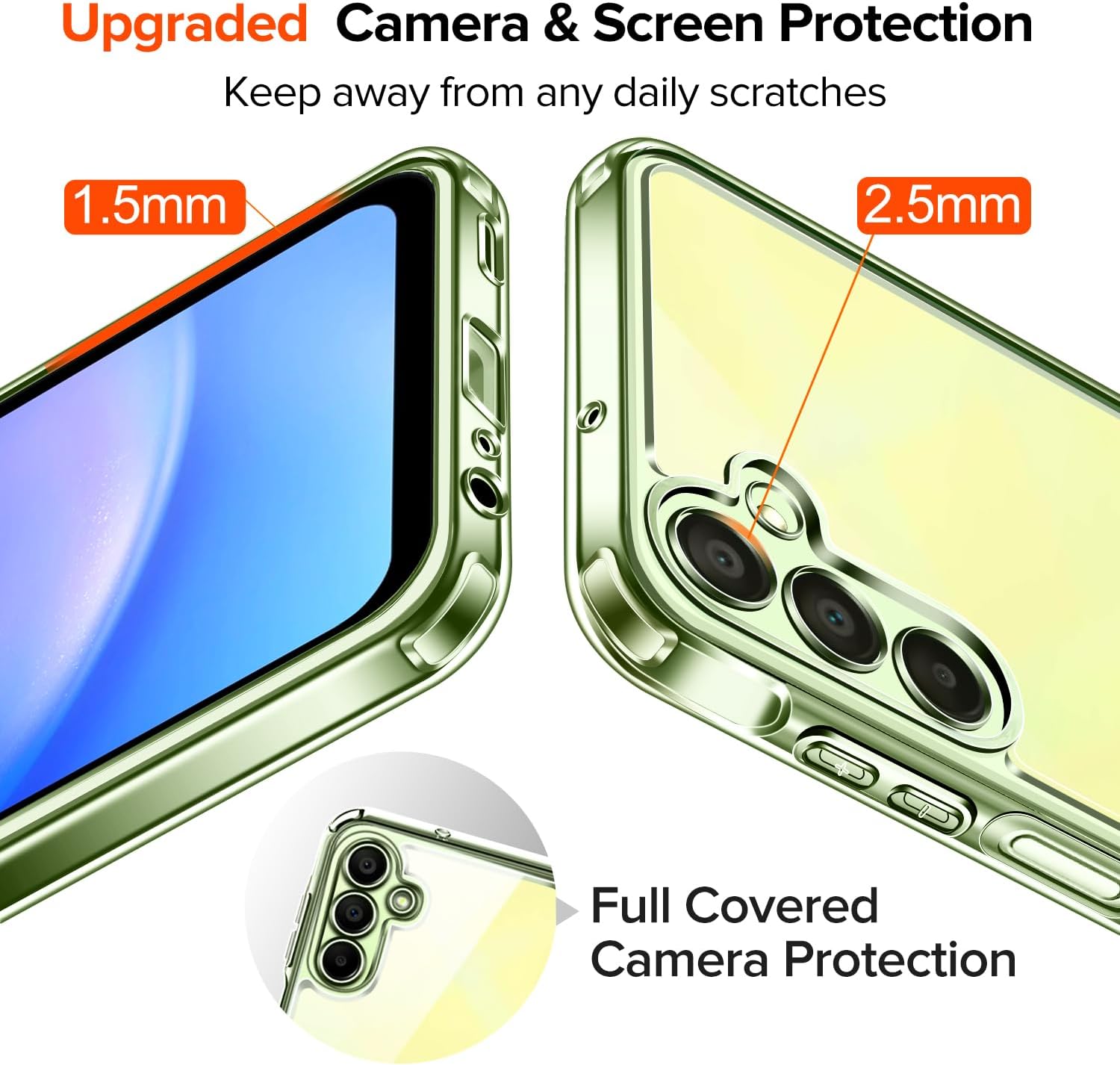 • [Повишена защита на камерата и екрана] --- Камерата и екранът са двете най-скъпи и крехки части на целия телефон. Повдигнатите ръбове около предния екран и обектива на камерата могат ефективно да се справят с последиците от внезапно падане или удар, без да надраскат красивия ви телефон!