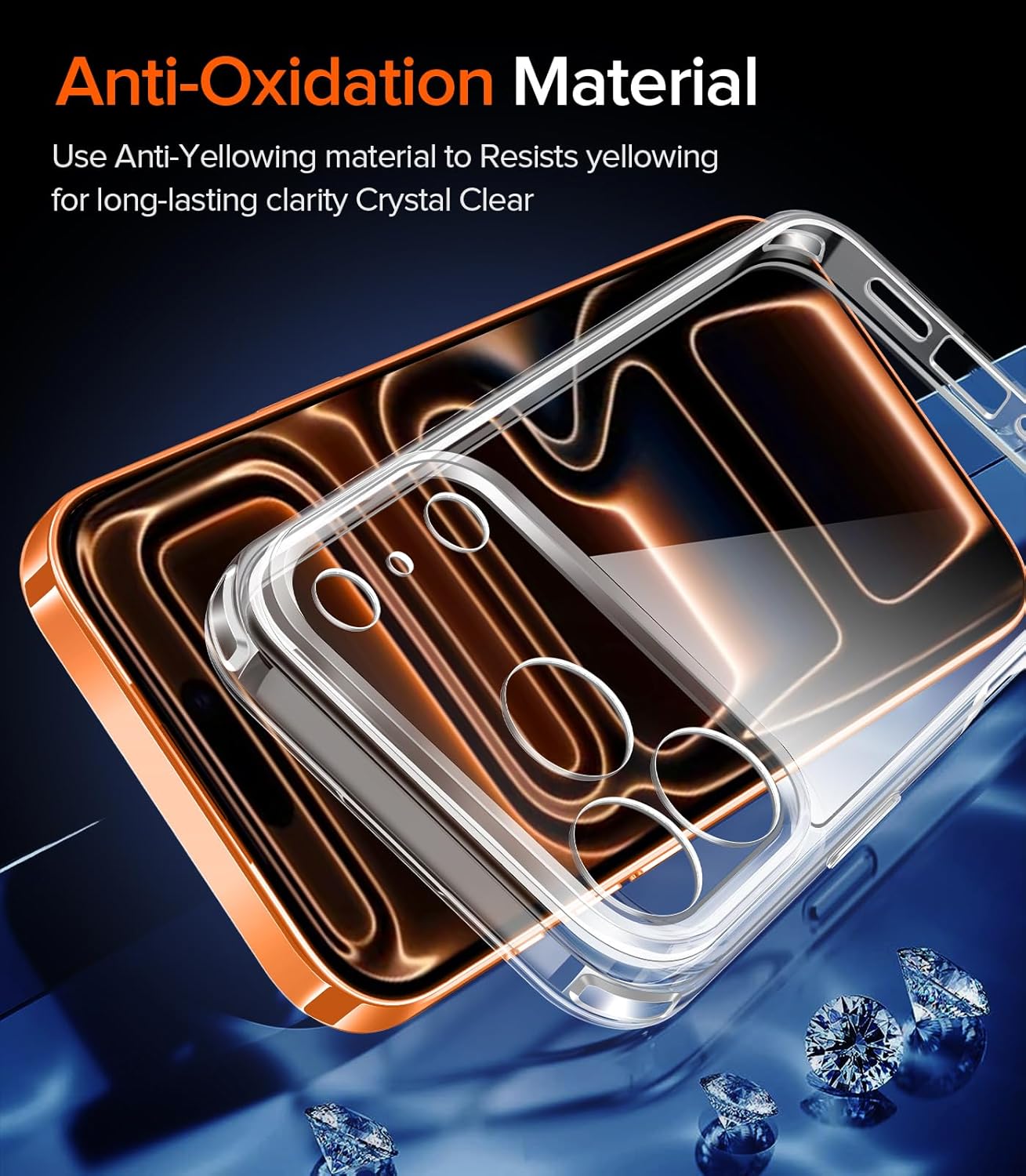 • Кристално чист и без пожълтяване: кристално прозрачният PC гръб остава без пожълтяване за по-дълго време. Използвайте ултрапрозрачния TPU материал от Германия, за да се насладите на оригиналната красота на вашия телефон. Нано антиоксидантният слой ефективно е устойчив на петна и пот, не се омазнява и не пожълтява лесно с времето, показвайки перфектно оригиналния цвят на вашия телефон.
