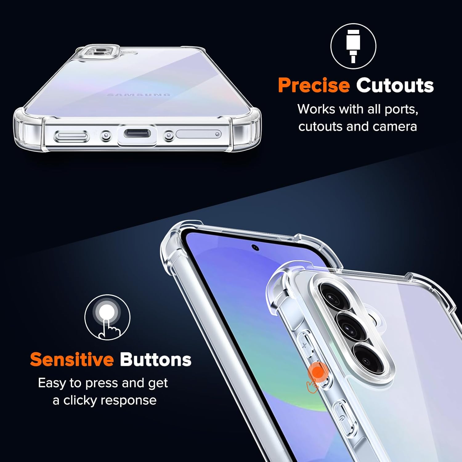 iVoler Never Yellowing прозрачен калъф за Samsung Galaxy A36 5G с удароустойчиви защитни ъгли, 1 калъф за мобилен телефон с 3 части защита от закалено стъкло, военна защита, прозрачен защитен