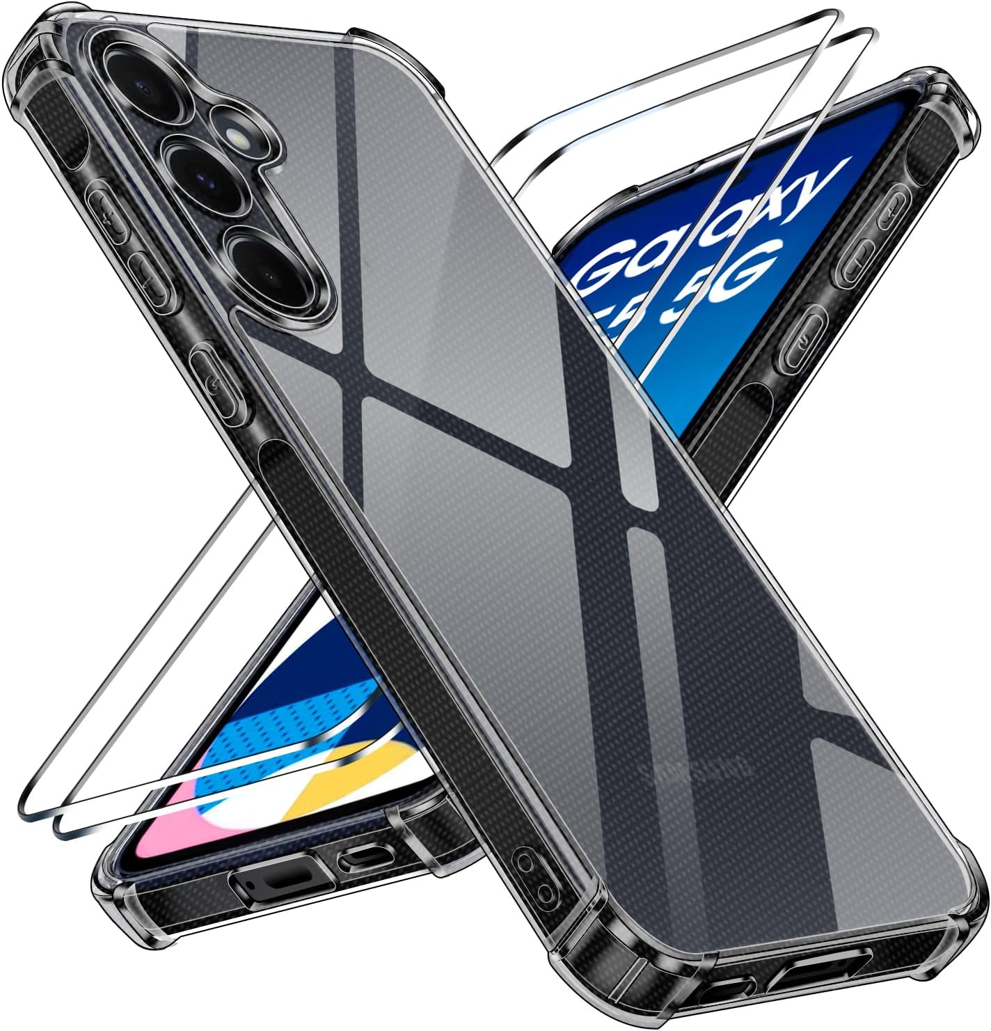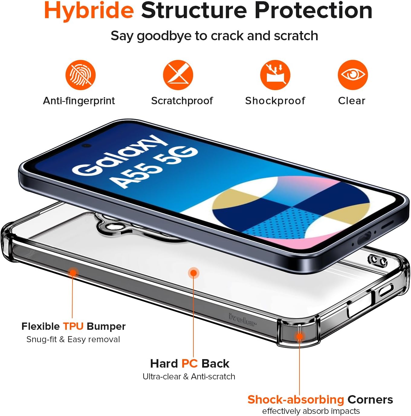 ivoler Never Yellowing прозрачен калъф за Samsung Galaxy A55 5G с удароустойчиви защитни ъгли, 1 калъф за мобилен телефон с 2 части закалено стъкло за защита прозрачен защитен калъф тънък прозрачен
