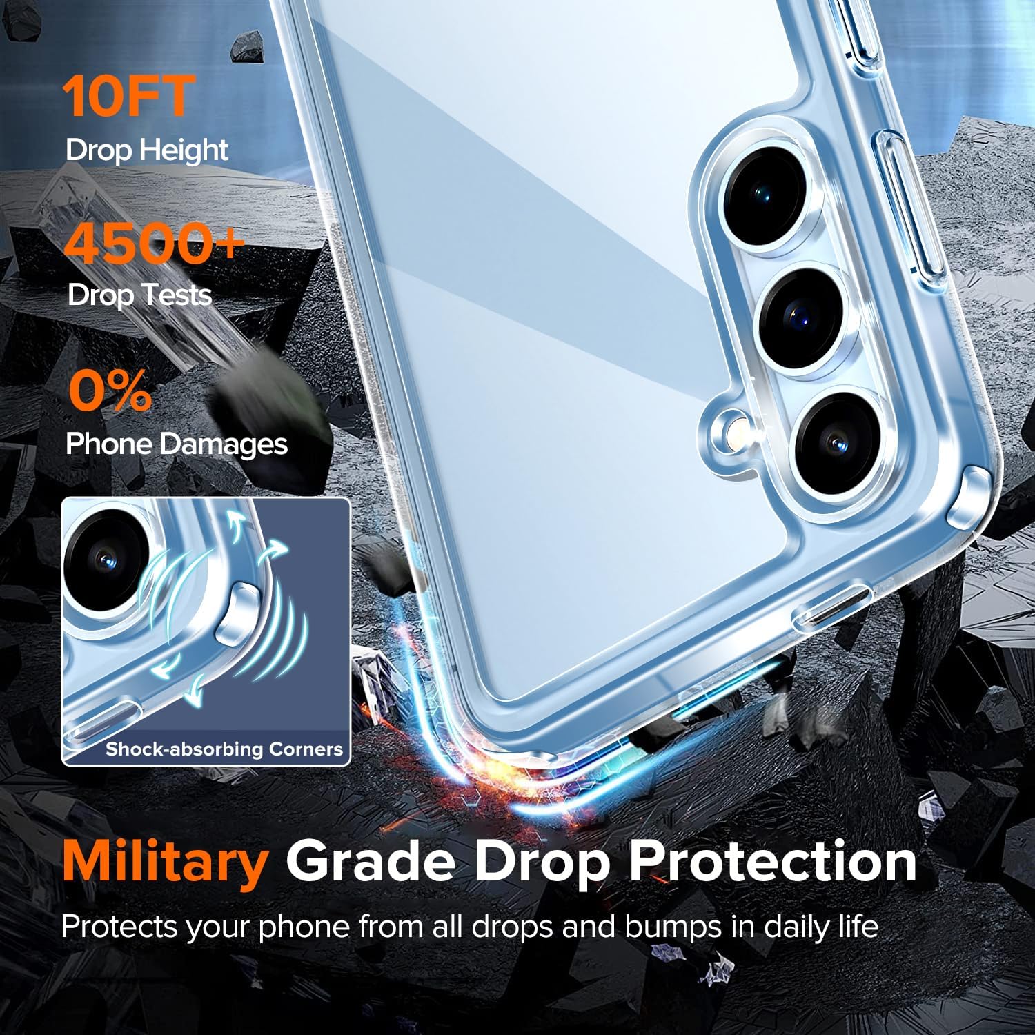 • Отлична защита от военно ниво: твърда PC задна плоча обгражда мека TPU броня с абсорбиращи ударите „въздушни възглавници“ в 4 ъгъла, които могат ефективно да абсорбират и разпределят 99,99% от удара при падане. Тестван да издържа на реални ситуации, включително тестове за падане от множество ъгли от 3 метра и екстремни надрасквания.