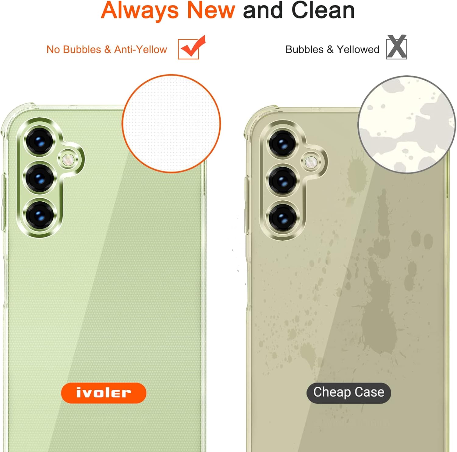 • Кристално чист и без пожълтяване: кристално прозрачният PC гръб остава без пожълтяване за по-дълго време. Използвайте ултрапрозрачния TPU материал от Германия, за да се насладите на оригиналната красота на вашия телефон. Нано антиоксидантният слой ефективно е устойчив на петна и пот, не се омазнява и не пожълтява лесно с времето, показвайки перфектно оригиналния цвят на вашия телефон.