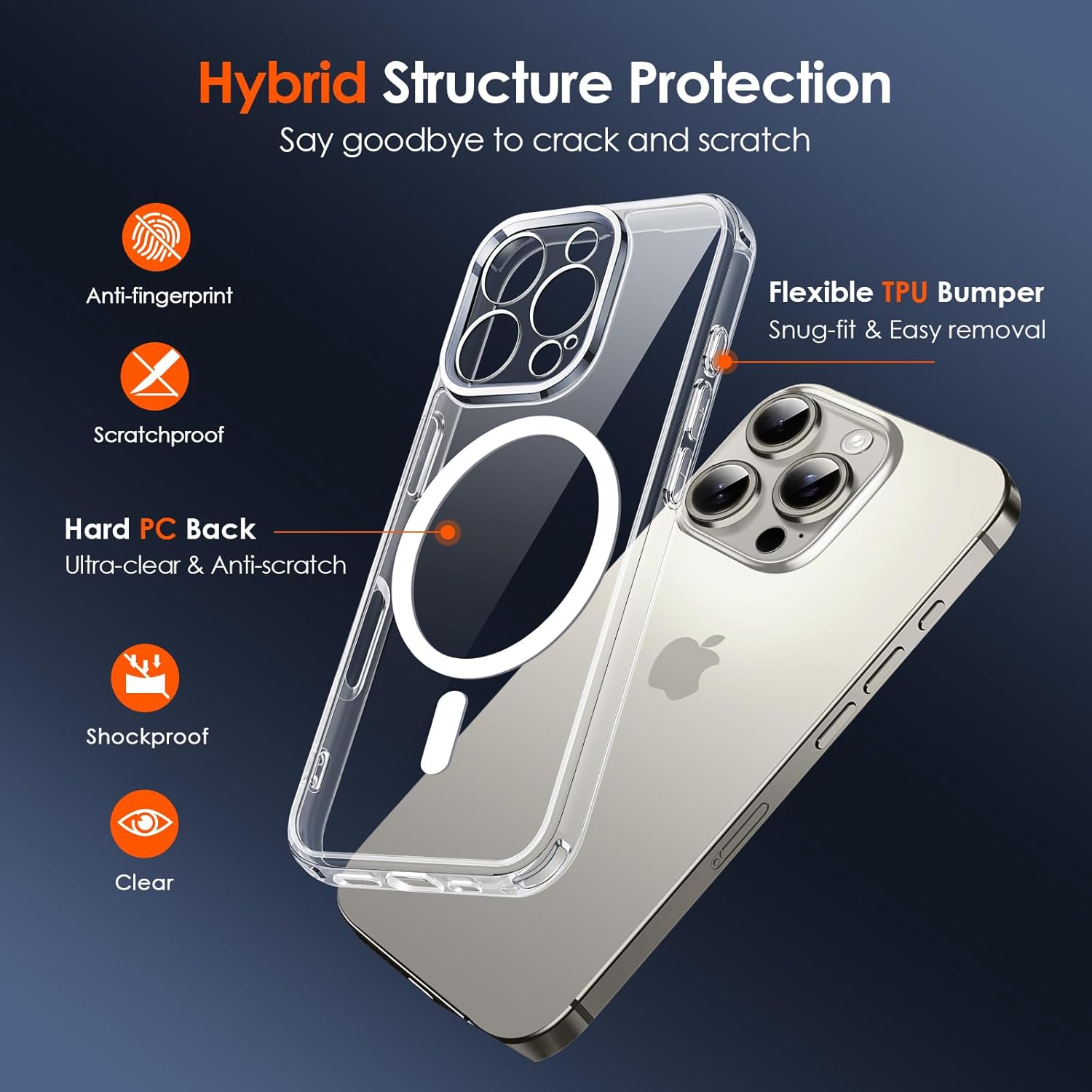 ivoler Прозрачен магнитен калъф за iPhone 16 Pro, никога не пожълтява, военна защита, удароустойчив, устойчив на надраскване, прозрачен защитен калъф
