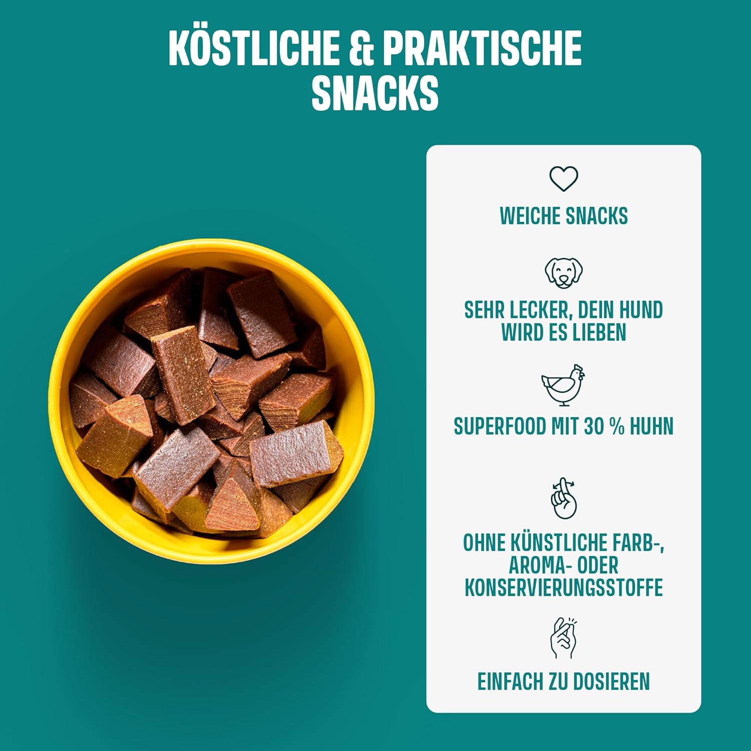 • Меки, вкусни и подходящи за ежедневна употреба. Меки закуски с 30% пилешко месо, лесни за дозиране – без изкуствени оцветители, ароматизатори или консерванти.