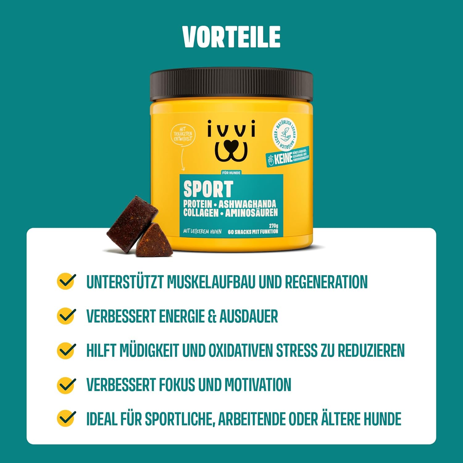 ivvi Sport – Функционални закуски за кучета | С протеин, ашваганда, колаген и аминокиселини | Подпомага изграждането и регенерацията на мускулите | 60 меки закуски (270 г)