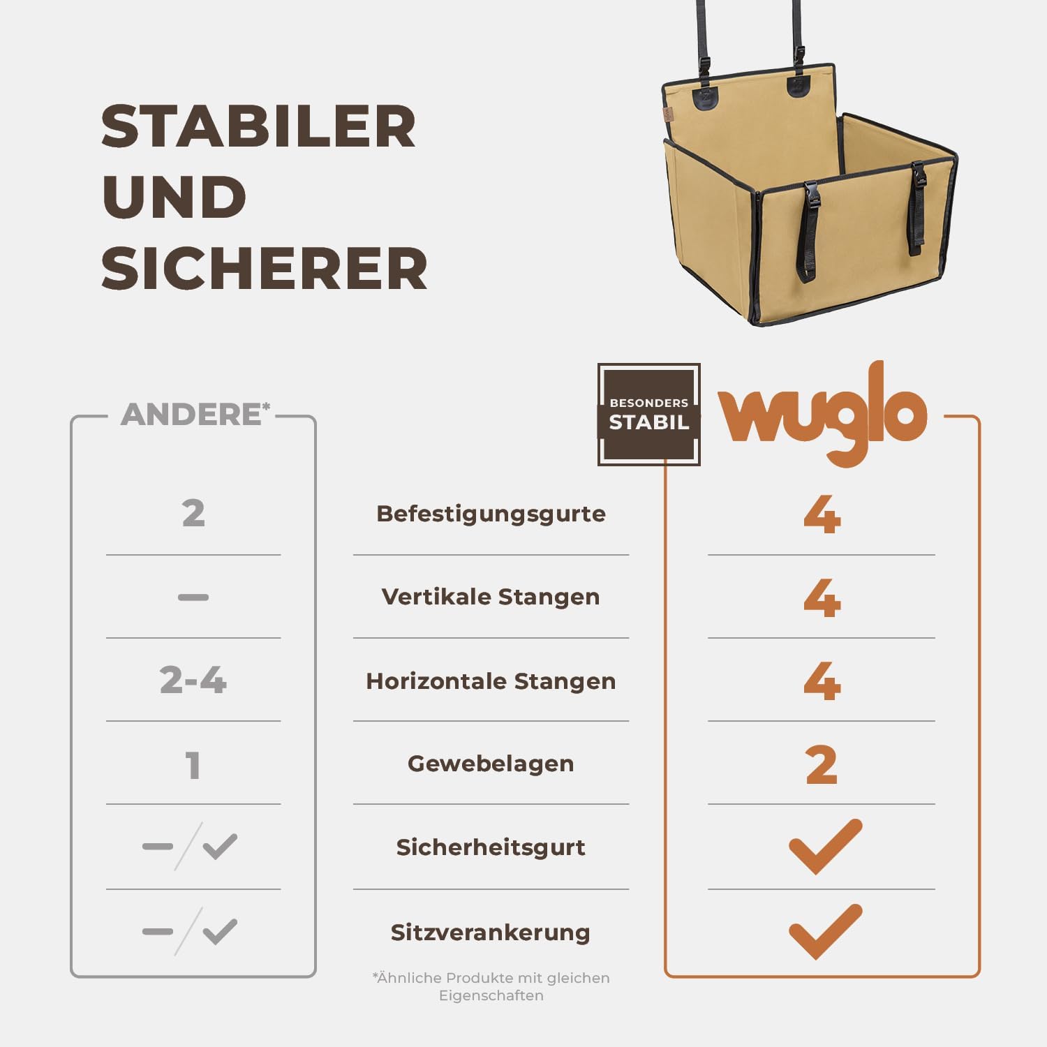 • Бърза и лесна употреба: Благодарение на бързия и лесен монтаж, столчето за кучета Wuglo се монтира за няколко минути. Дизайнът позволява столчето да се закрепи удобно към задната седалка, а прътите могат лесно да се свалят.