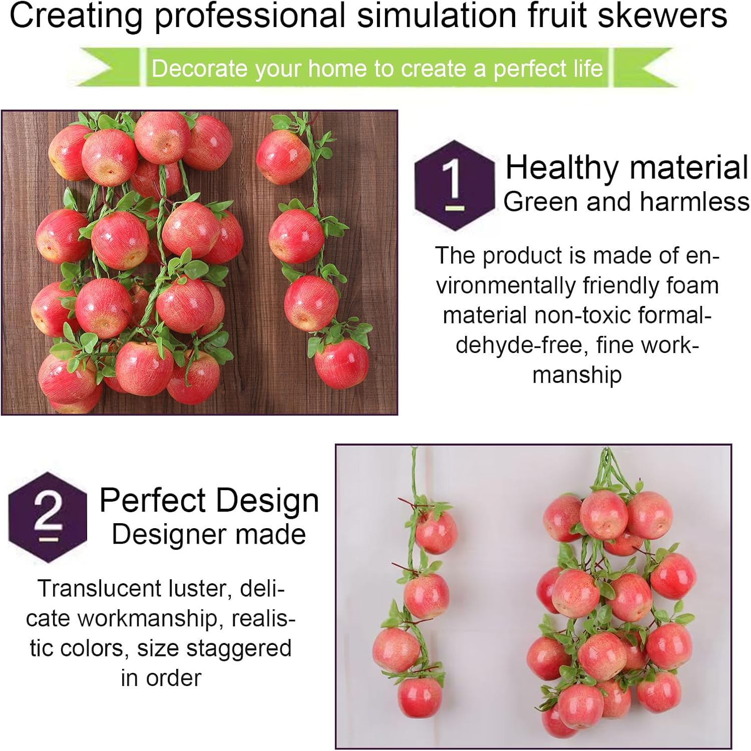 Изкуственото грозде е изработено от PE пластмаса, висококачествено и леко. Изкуственото грозде има дълъг живот и е лесно за почистване, просто трябва да избършете праха по листата. Перфектна декорация за дома, търговския център, градината, хотела, фото реквизит за пазар на плодове и др.