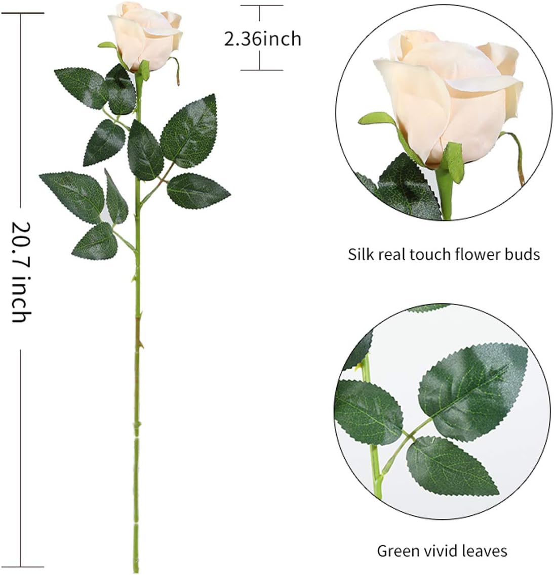 • Материал: Копринени (истински допир) цветя и листа; Метална тел като скелет, обвита в пластмаса. Дългото стъбло може да се подрязва или огъва, нетоксичен цвят, който няма да избледнее с времето, перфектен избор за хора, страдащи от поленови алергии.