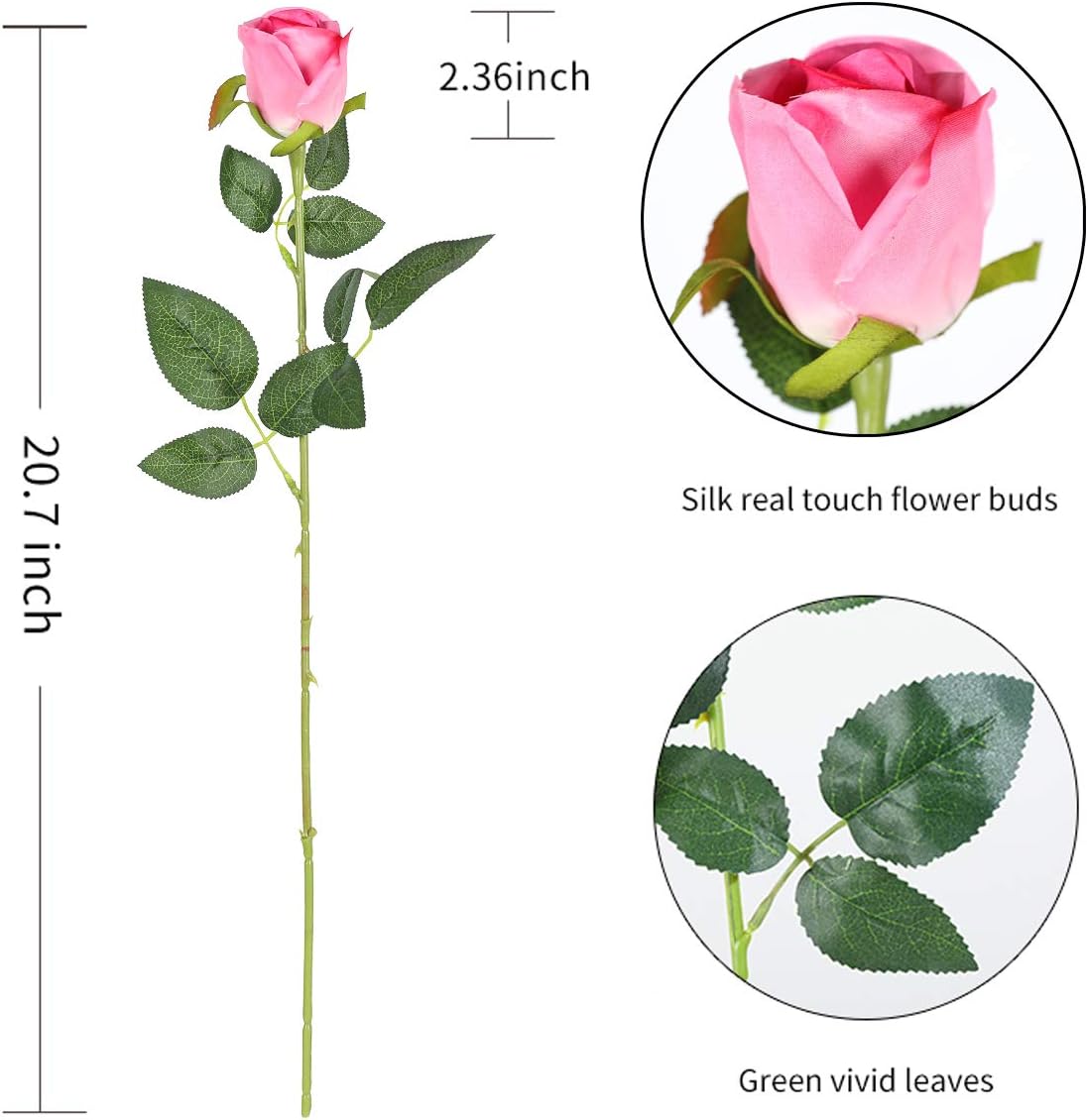 • Материал: Копринени (истински допир) цветя и листа; Метална тел като скелет, обвита в пластмаса. Дългото стъбло може да се подрязва или огъва, нетоксичен цвят, който няма да избледнее с времето, перфектен избор за хора, страдащи от поленови алергии.