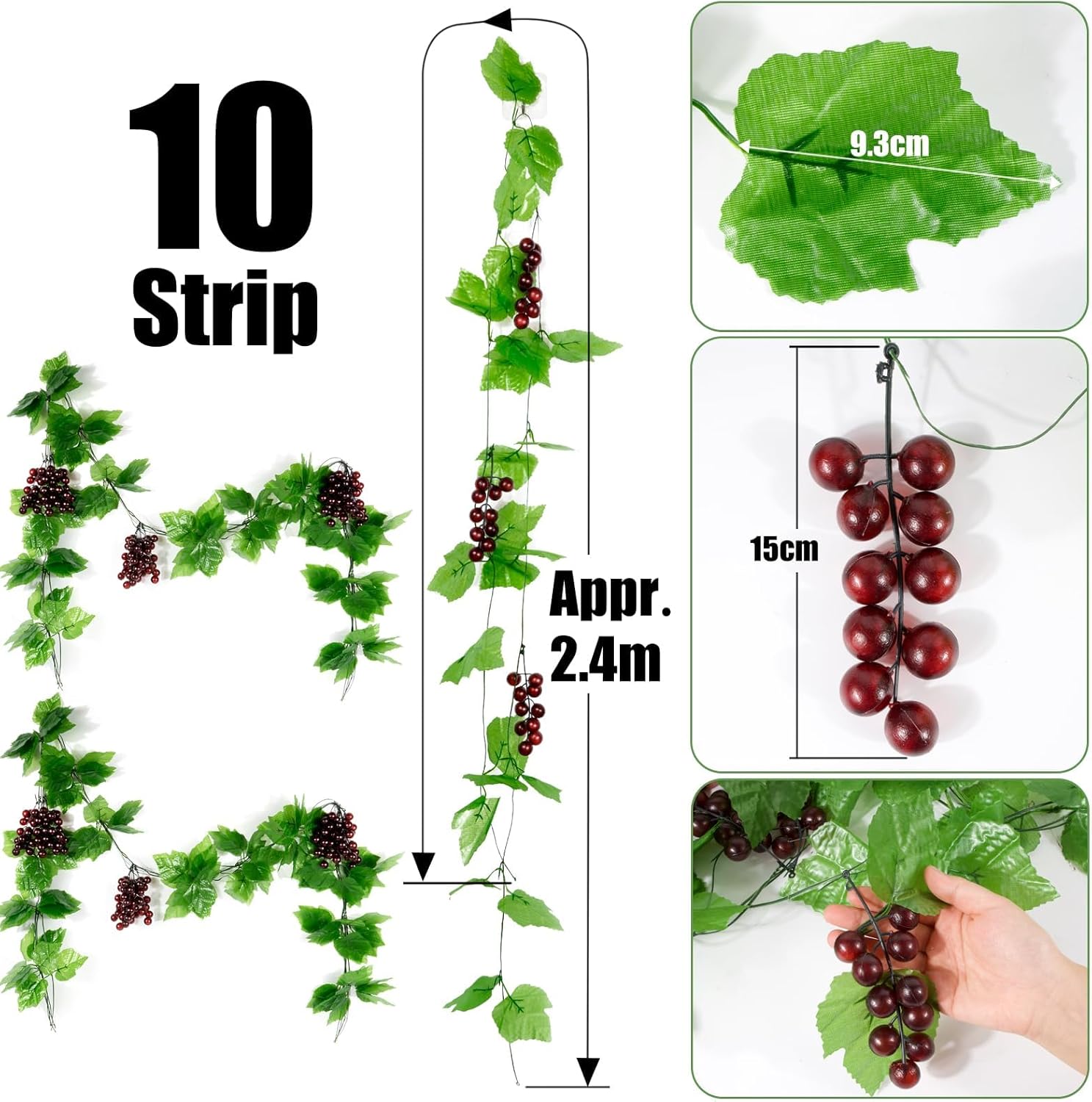 • Размер: всяка изкуствена лоза е с дължина 2,4 м, общо 24 м, гроздето е с дължина 15 см.