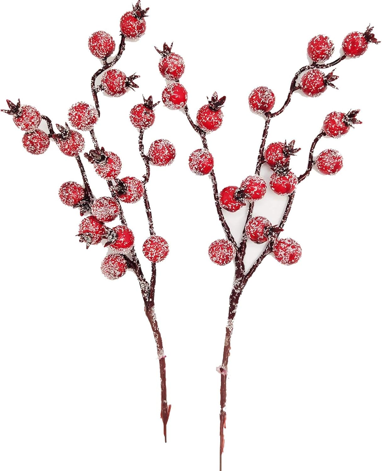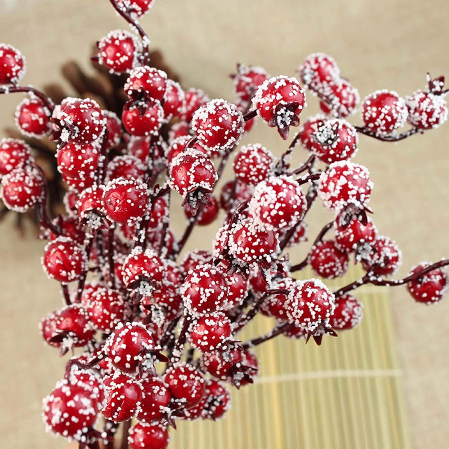 Тези клонки са украсени с яркочервени плодове и нежни снежинки, идеални за коледна украса.