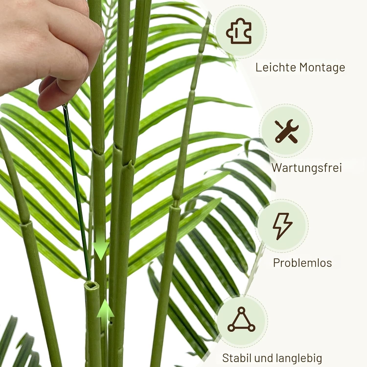 • Тази много реалистична изкуствена палма е изработена от издръжлив и висококачествен полиестерен материал, дъното на черната саксия е покрито със зелена дървесна плява и е ръчно засадена с истинска дървесна кора, която е по-реалистична и естествена от изкуствената пластмасова кора, „изглежда толкова истинска, че е почти като живи зелени растения!“