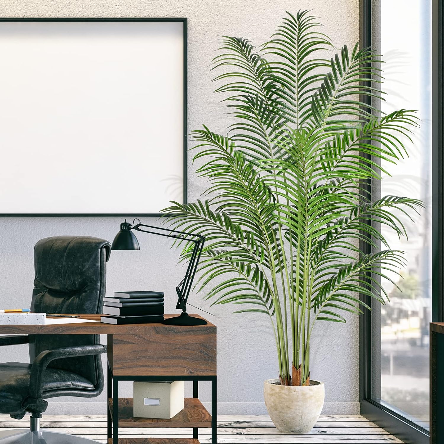 • Тази изкуствена палма с височина 170 см има 15 гладки, недокоснати ствола, свързани с до 570 куполообразни, подобни на пера листа с реалистична текстура. Тя придава на вашата крайбрежна декорация автентичен и естествен вид, който трае цял живот, без поливане или подрязване, изглежда плътна и свежа всеки ден.
