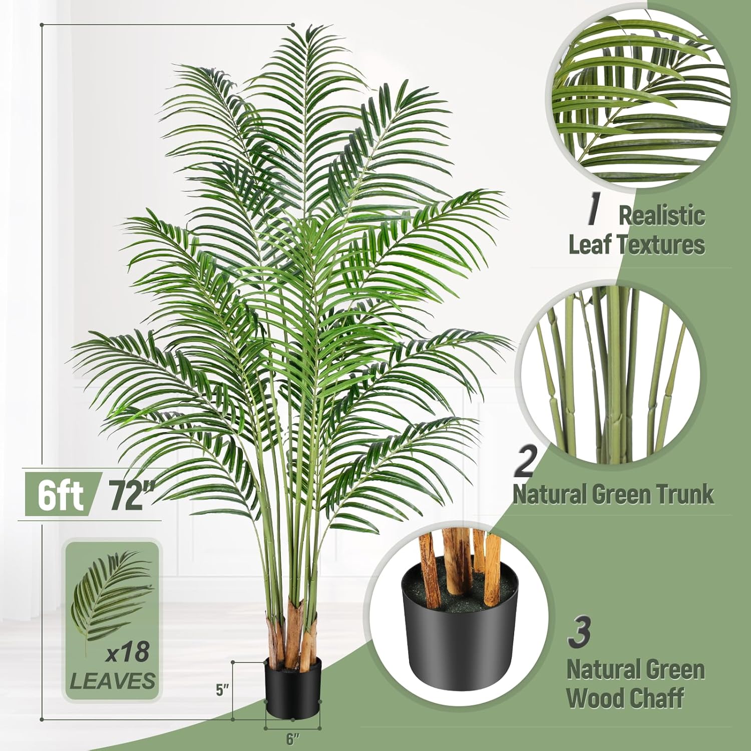 • Тази много реалистична изкуствена палма е изработена от издръжлив и висококачествен полиестерен материал, дъното на черната саксия е покрито със зелена дървесна плява и е ръчно засадена с истинска дървесна кора, която е по-реалистична и естествена от изкуствената пластмасова кора, „изглежда толкова истинска, че е почти като живи зелени растения!“