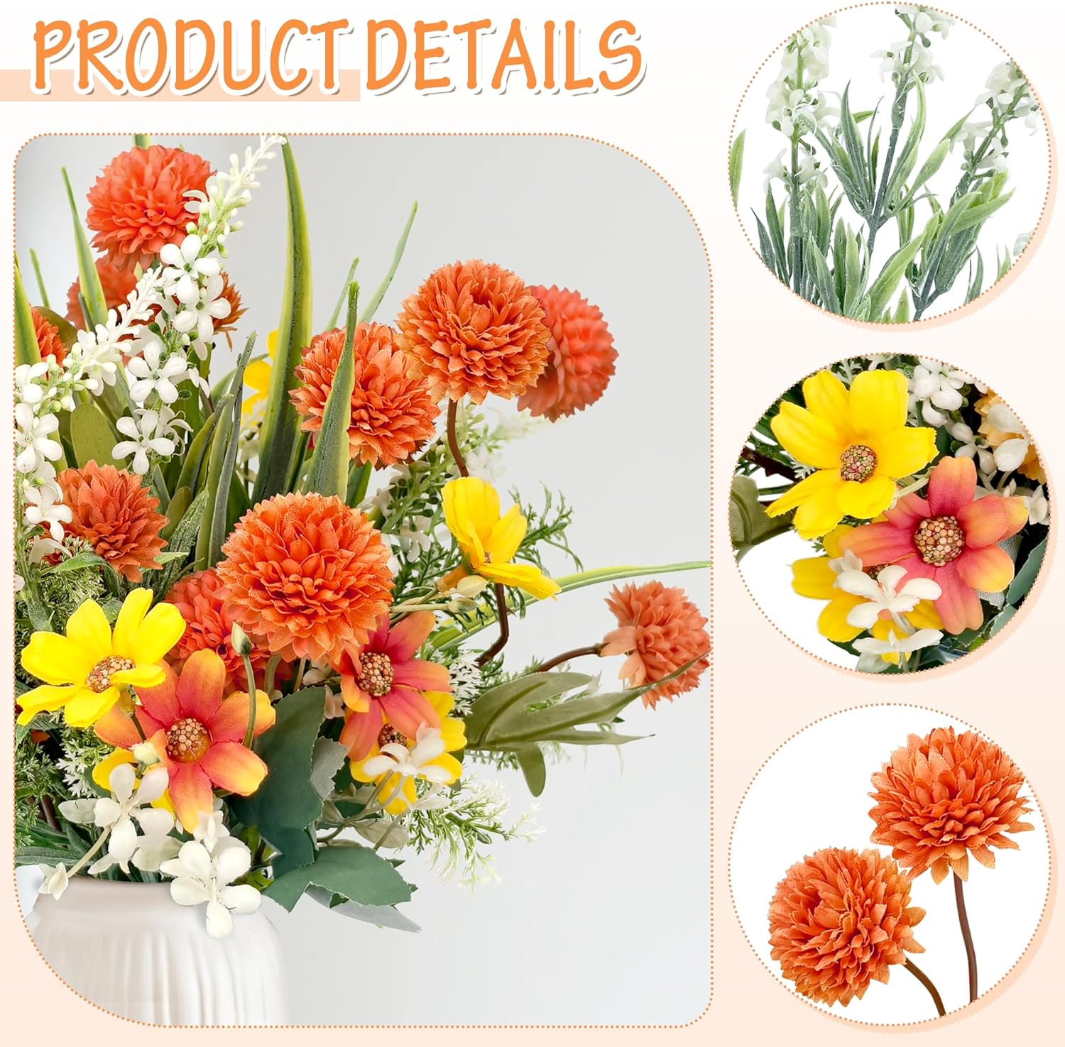 • Висококачествена изработка: цветната глава е изработена от висококачествен плат, повърхността на стъблото е от пластмаса, отвътре е с тел, може да се огъва по желание. Можете да отрежете цветята по-късо, за да подхождат на вашата ваза. Изкуствените цветя, подобно на истинските, никога не се нуждаят от поливане, поддръжка или пресаждане.