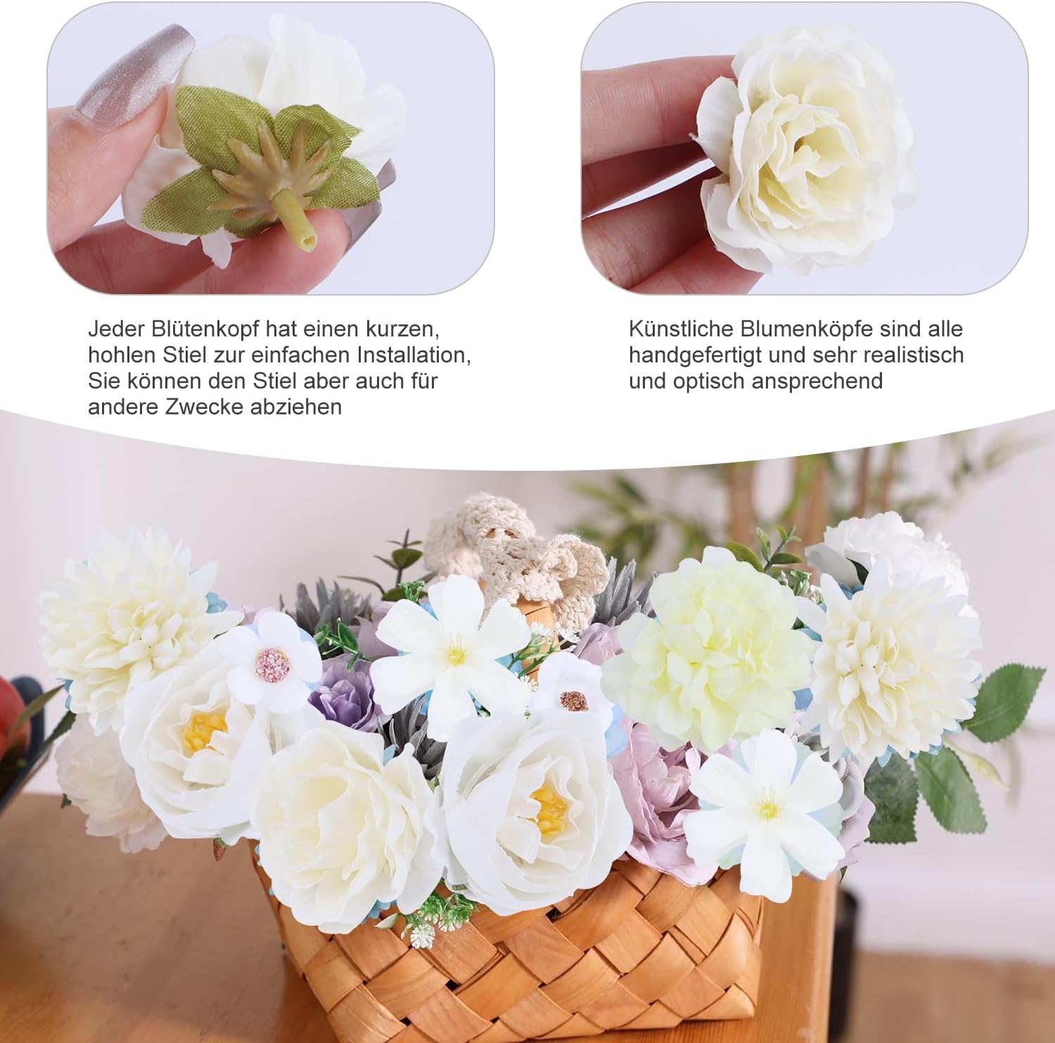 Всяка цветна глава има кухо късо стъбло, което е лесно за изработка и закрепване. Можете също така да отрежете задната част на цветето за други цели.