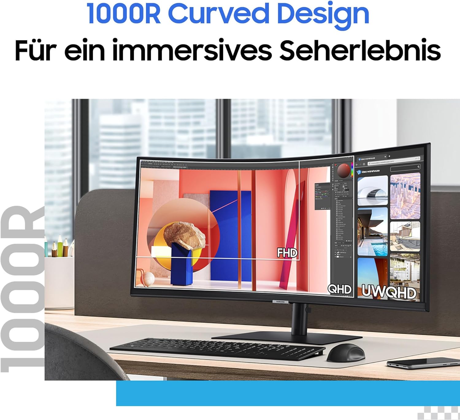 • Детайлен дисплей, ярки изображения с наситени цветове: монитор на Samsung с VA панел с резолюция 3440 x 1440 пиксела, HDR10, яркост 350 cd/m² и контрастно съотношение 3000:1