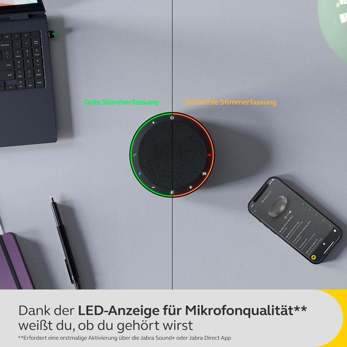 • 4-те микрофона с формиране на лъча улавят шум от всички посоки и намаляват разсейващия фонов шум. Изравняването на гласа свежда всички гласове до еднаква сила на звука.