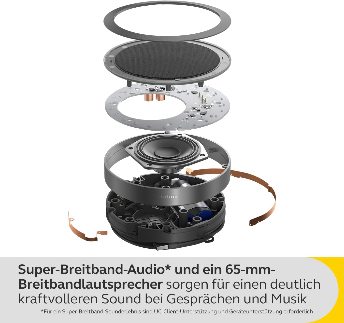 • МАКСИМАЛНА ПРОИЗВОДИТЕЛНОСТ 50-милиметровите широколентови високоговорители и широколентовият звук осигуряват прецизно качество на звука. Пълният дуплексен звук позволява естествено протичане на разговора.
