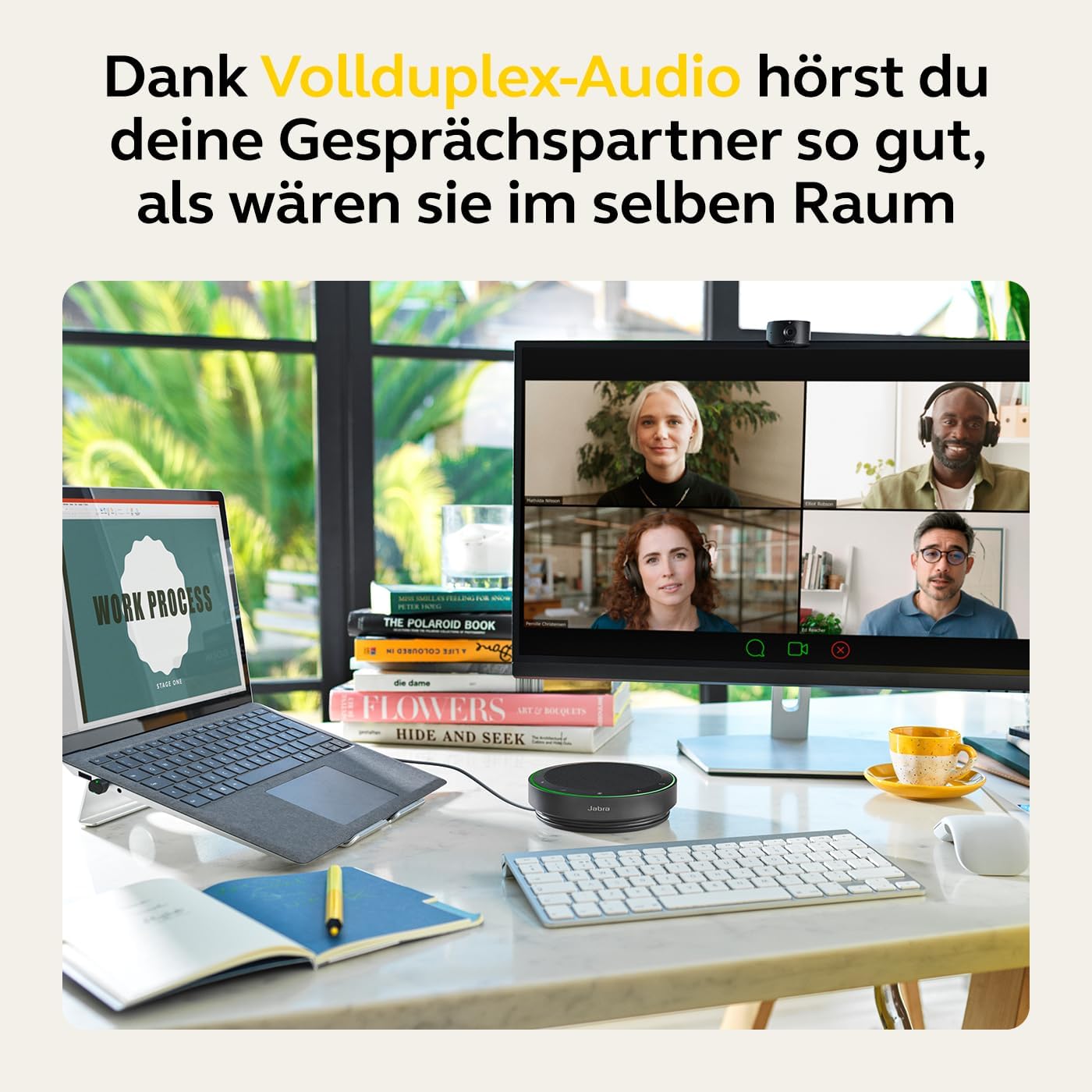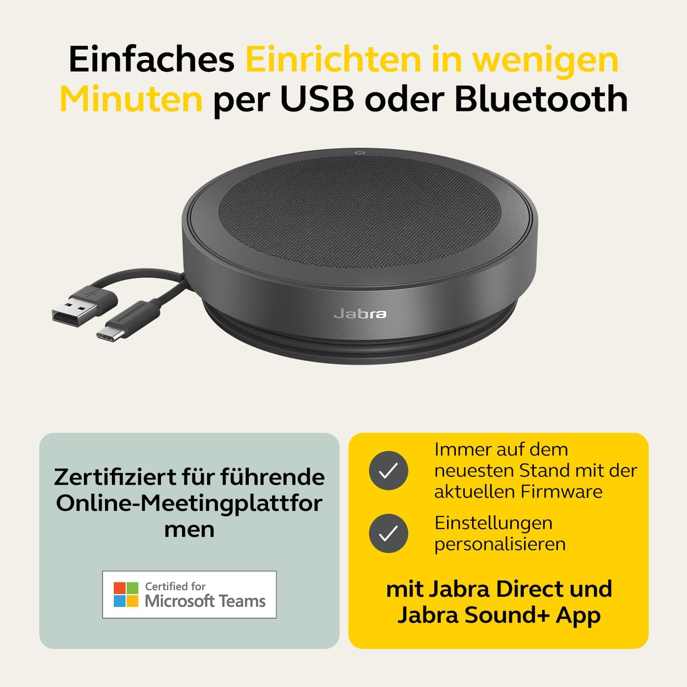 Jabra Speak2 75 Безжично решение за свободни ръце с USB-C Bluetooth адаптер, 4 микрофона с шумопотискане, 65 мм широколентов високоговорител, сертифициран от MS Team, тъмносив